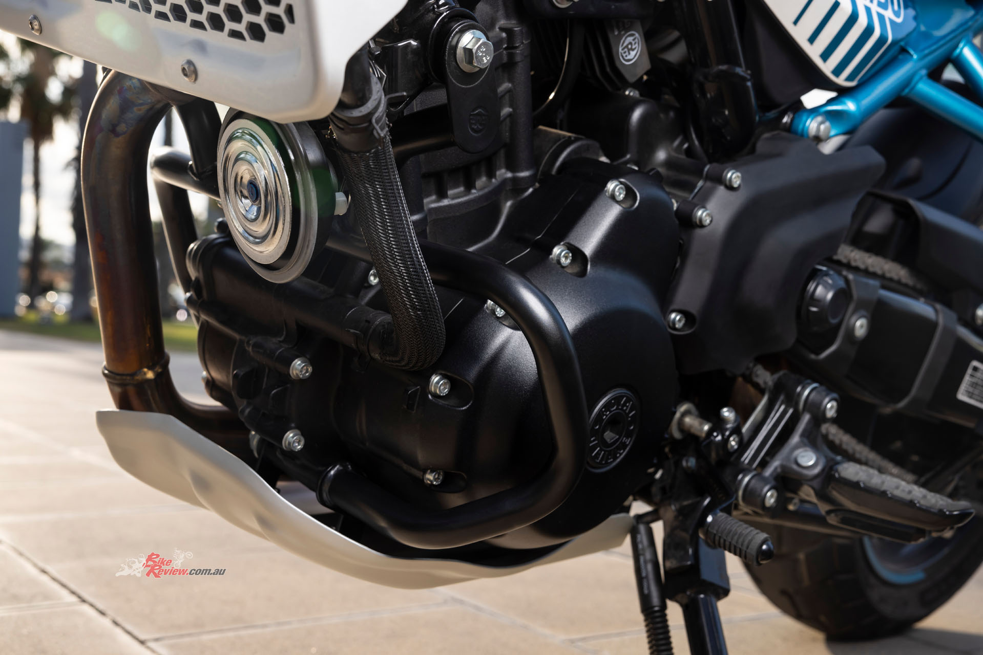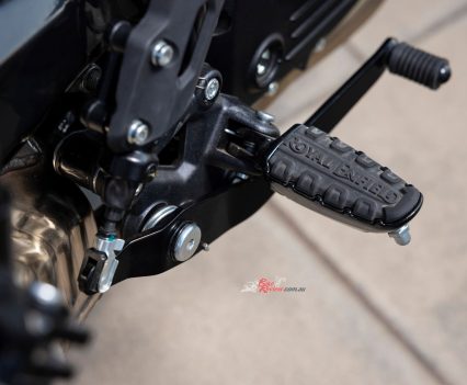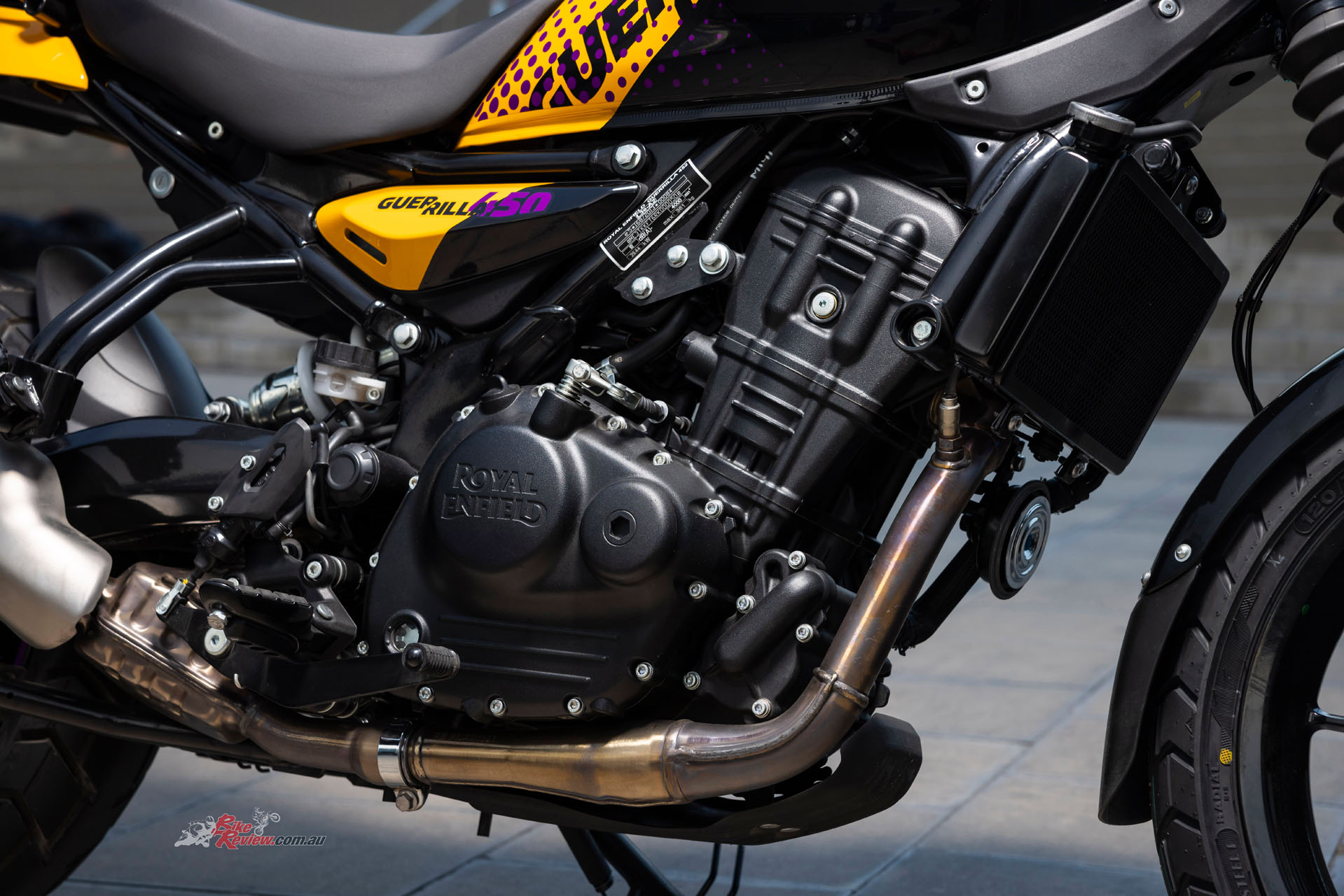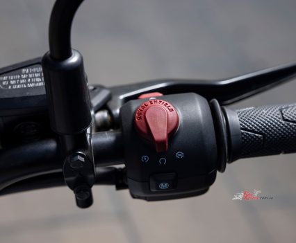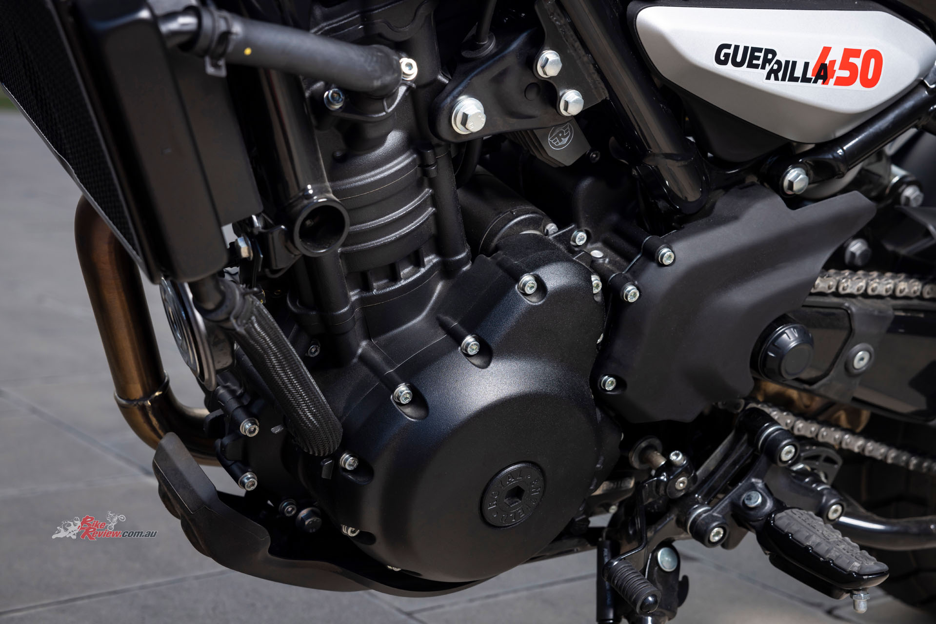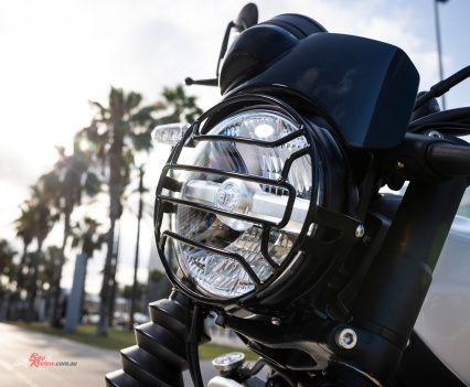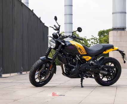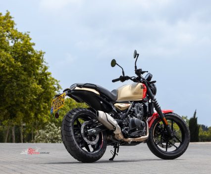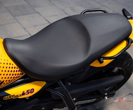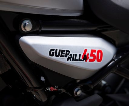 Sharing the 452cc Sherpa engine with the Himalayan 450 but re-mapped for street use, with a 42mm throttle-body, RbW throttle and 84mm x 81.5mm bore x stroke, the Guerrilla run an 11.5:1 compression ratio and makes a learner legal friendly 29.44kW@8000rpm and 40Nm@5500rpm. It also features a slipper clutch (cable actuation) and a six-speed gearbox.