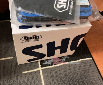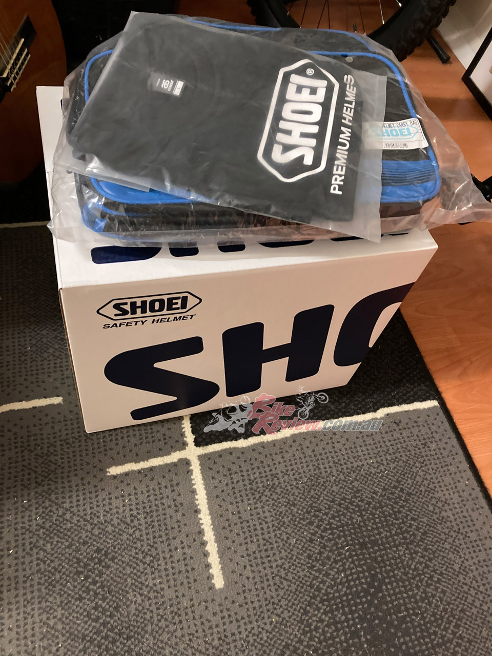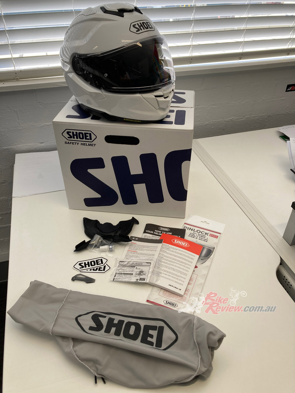 SHOEI helmets are boxed up perfectly, which is typical of most high quality Japanese product. Japanese brands take pride in packaging, which is old school and very cool. This means that nerds like me keep boxes, bags and wrappers! Hey, I build Tamiya models and I cut the box art out and display it! Like all SHOEI lids, the GT-Air 3 comes with stickers (which one goes onto my beer fridge in the shed and one gets kept as a spare), a breath guard, manuals, lubricant and soft bag.
