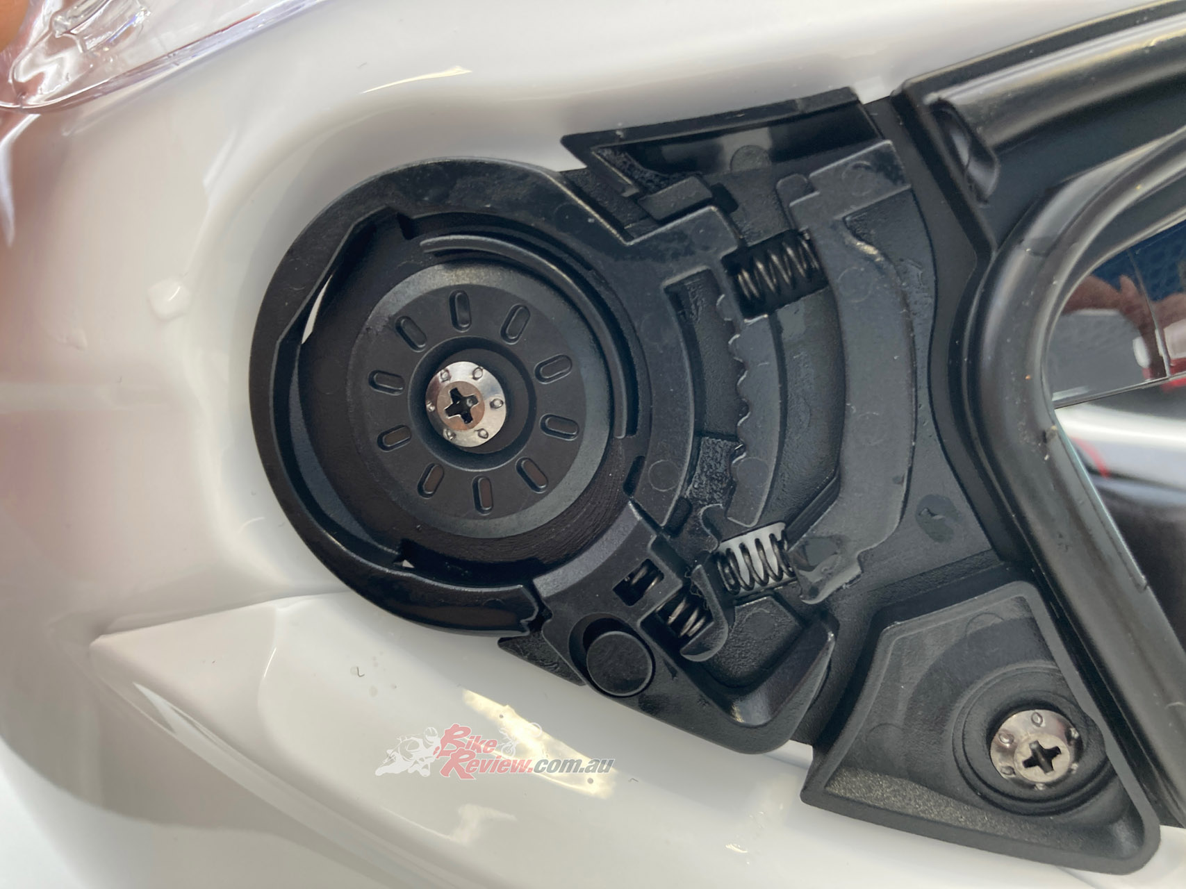 Let’s talk about the new thinner chin strap. Am I a fan? In terms of comfort, I am, but I would prefer a wider chin strap, it just feels safer and more secure, a bit like a wide seatbelt compared to a narrow one, It’s psychological more than anything. I love the ratchet system SHOEI use, always have. The visor is super easy to change over, quickly, pops out and clicks back in. I lubed the mechanisms up.