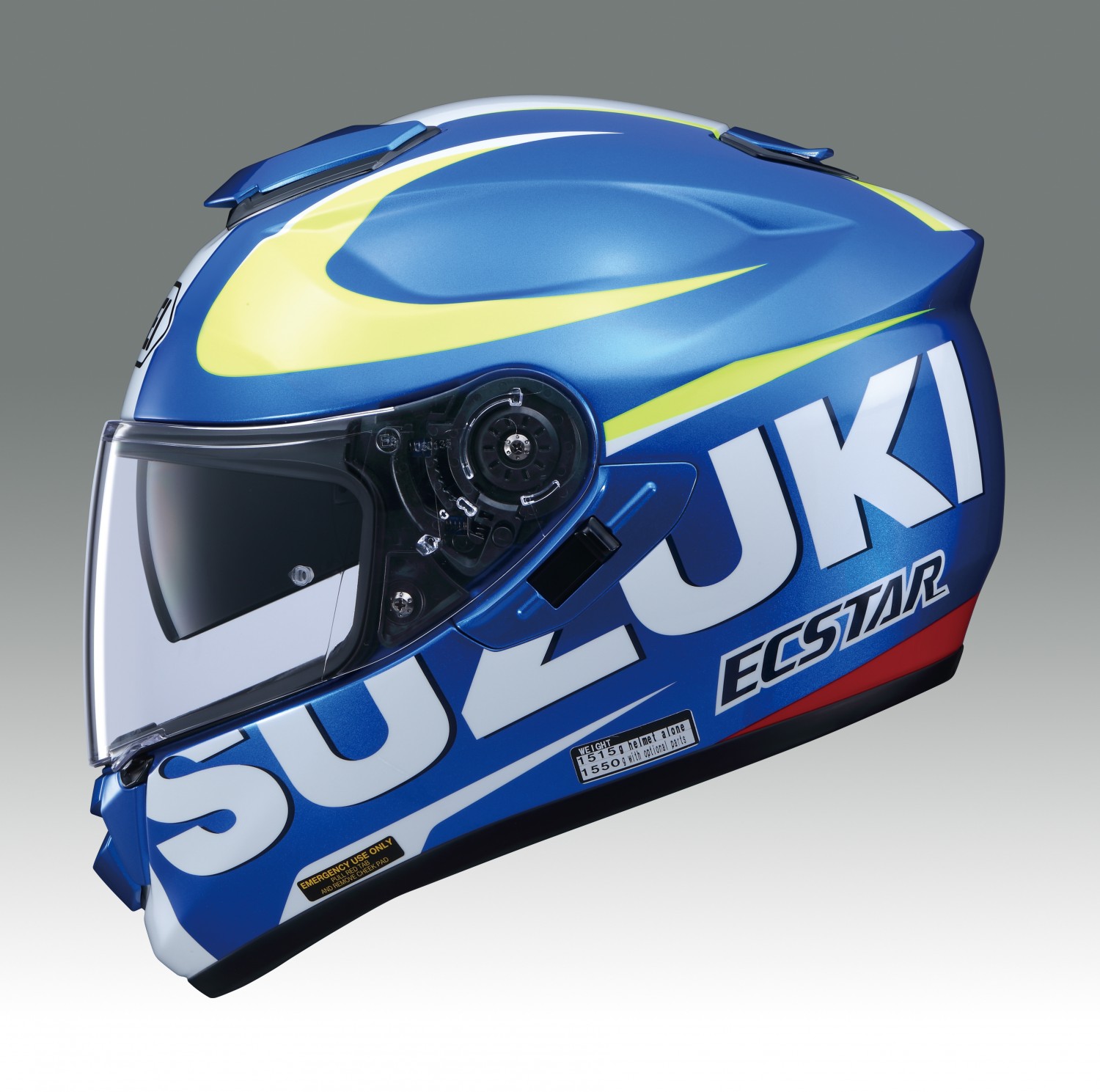 Available exclusively through Suzuki dealers, this premium helmet features AIM+ (Advanced Integrated Matrix Plus Multi-Fibre) construction, EPS-liner system, CNS-1 anti-fog pinlock system, Emergency Quick Release System (EQRS), QSV-1 internal sun visor, removable/washable cheek pads, efficient ventilation, integrated spoiler and Team Suzuki Ecstar graphics.
