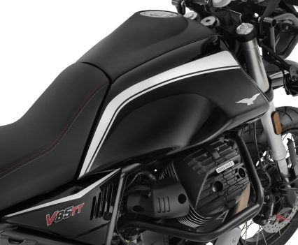 Just like the V85 TT bikes delivered to the Head of State at the Quirinal Palace, the V85 TT Guardia d’Onore features the typical black livery with white graphics that characterise the Cuirassiers’ Moto Guzzi machines. The white decorations run along the front mudguard, continuing onto the fuel tank and the side panels and they are also picked up on the oversized Touring windscreen. The latter is part of the standard equipment package, along with the centre stand, the engine guard bars and the supplementary LED lights. The pair of side panniers dedicated to this model are available on request.
