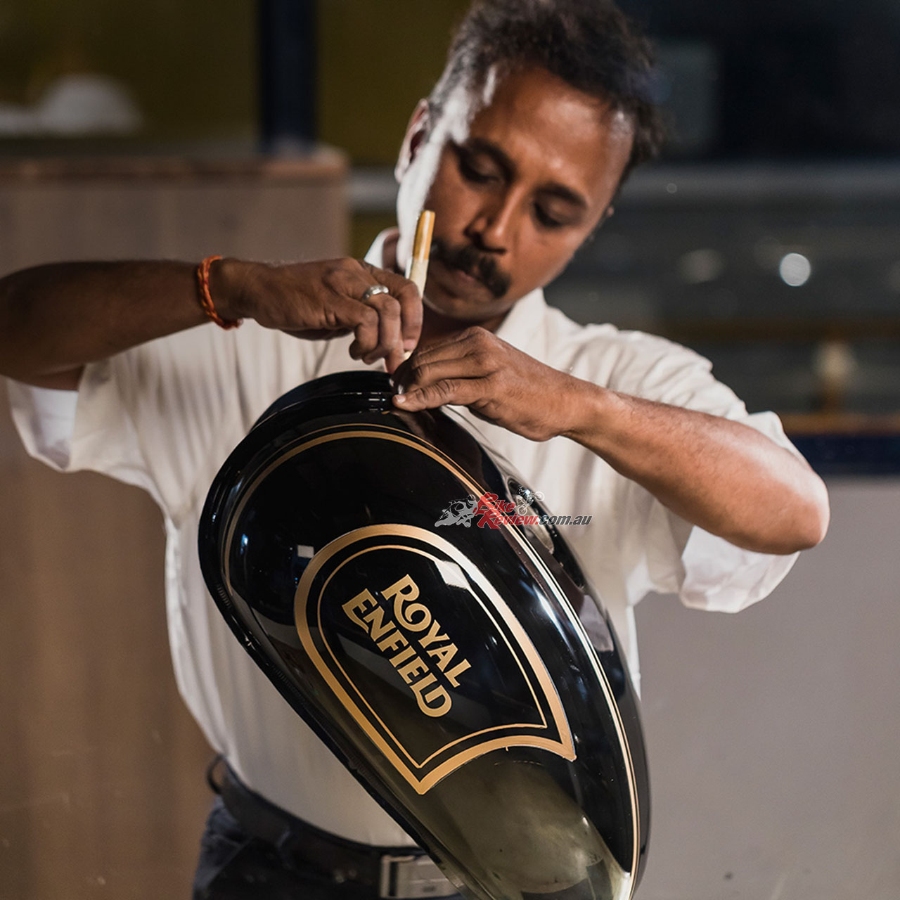 Each of the Classic 500 Tribute Black motorcycles are handcrafted at the iconic Oragadam factory in Chennai. The Tribute Black is hand painted with the Royal Enfield pinstripes by the Kumar brothers, celebrating this long standing Royal Enfield build tradition.