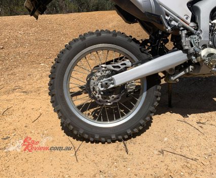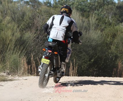 The brakes hold up nicely for me and being a heavier rider at 100kg that’s quite a task. No issues on the dirt at all, meaning I am usually super confident and comfortable grabbing the front and locking the rear at every corner. Enough feel and power for what the bike is.