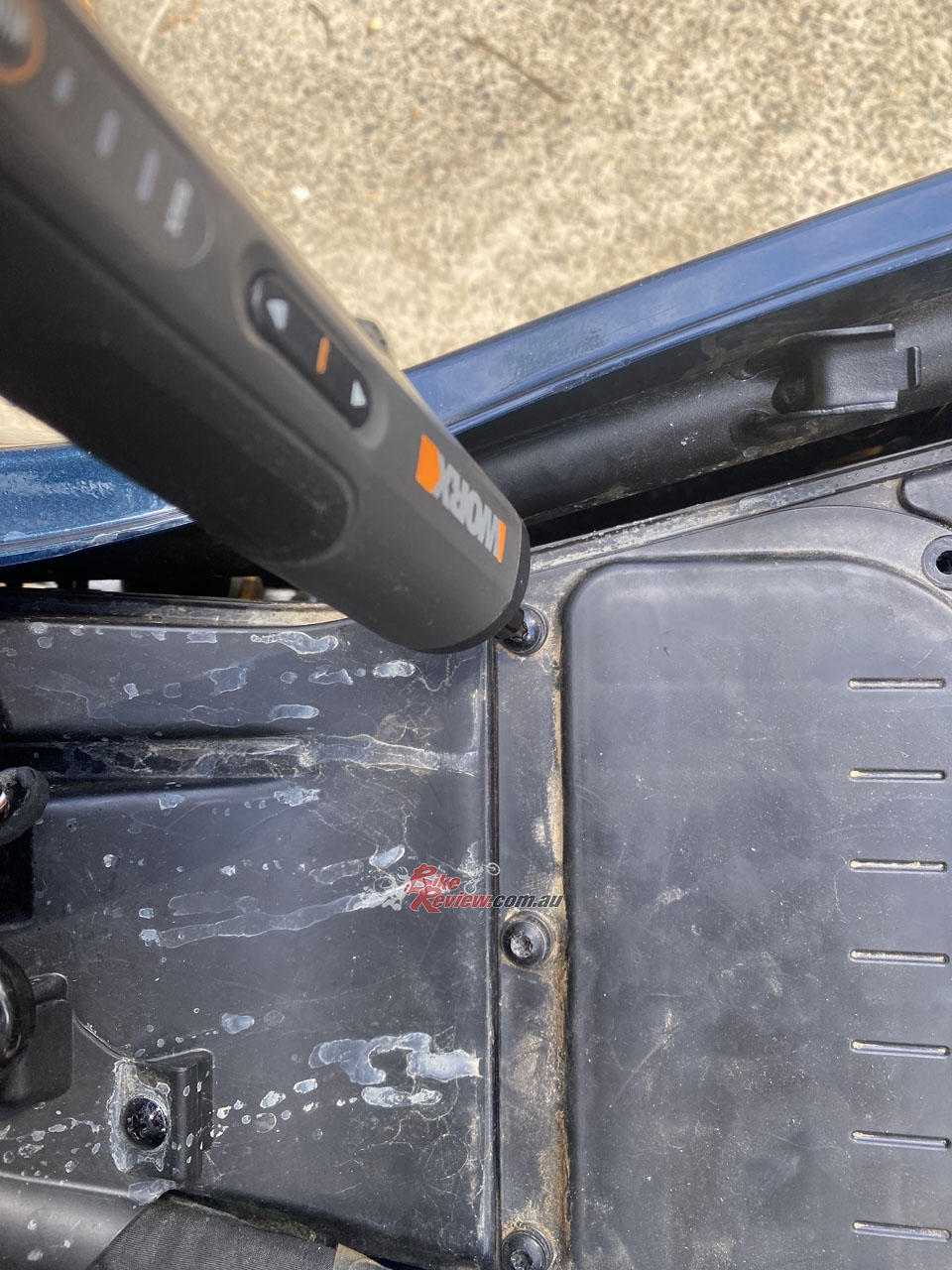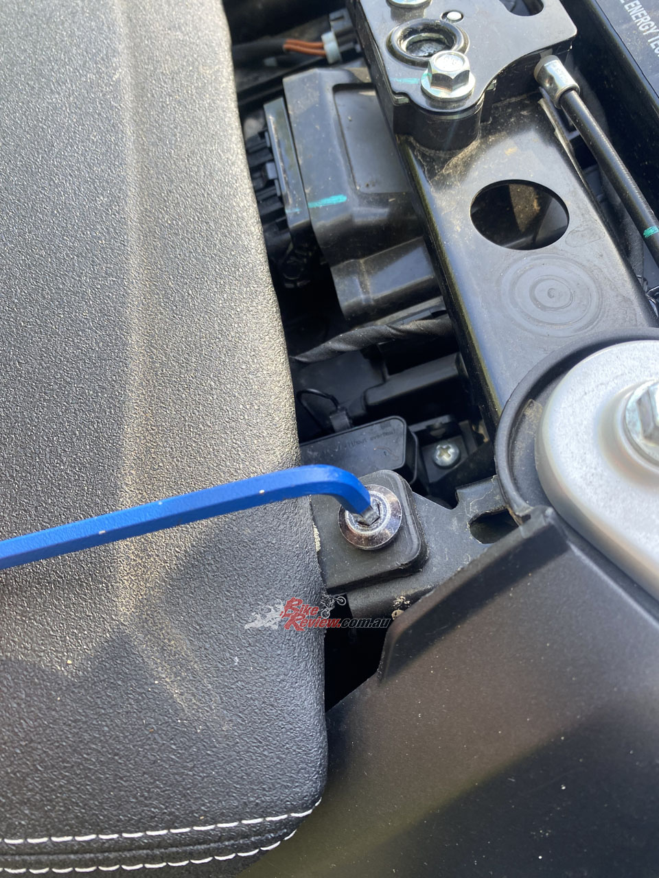 After removing the rear seat using the key (the barrel is hidden up by the pillion grab rail) you’ll need to remove the two 5mm Allen key bolts that hold the main seat in place. Be careful, as the heated seat cables stop the seat from coming off completely, and you don’t want to let it hang down and damage the connections. There is just enough slack in it to fold it back up and over the battery compartment.