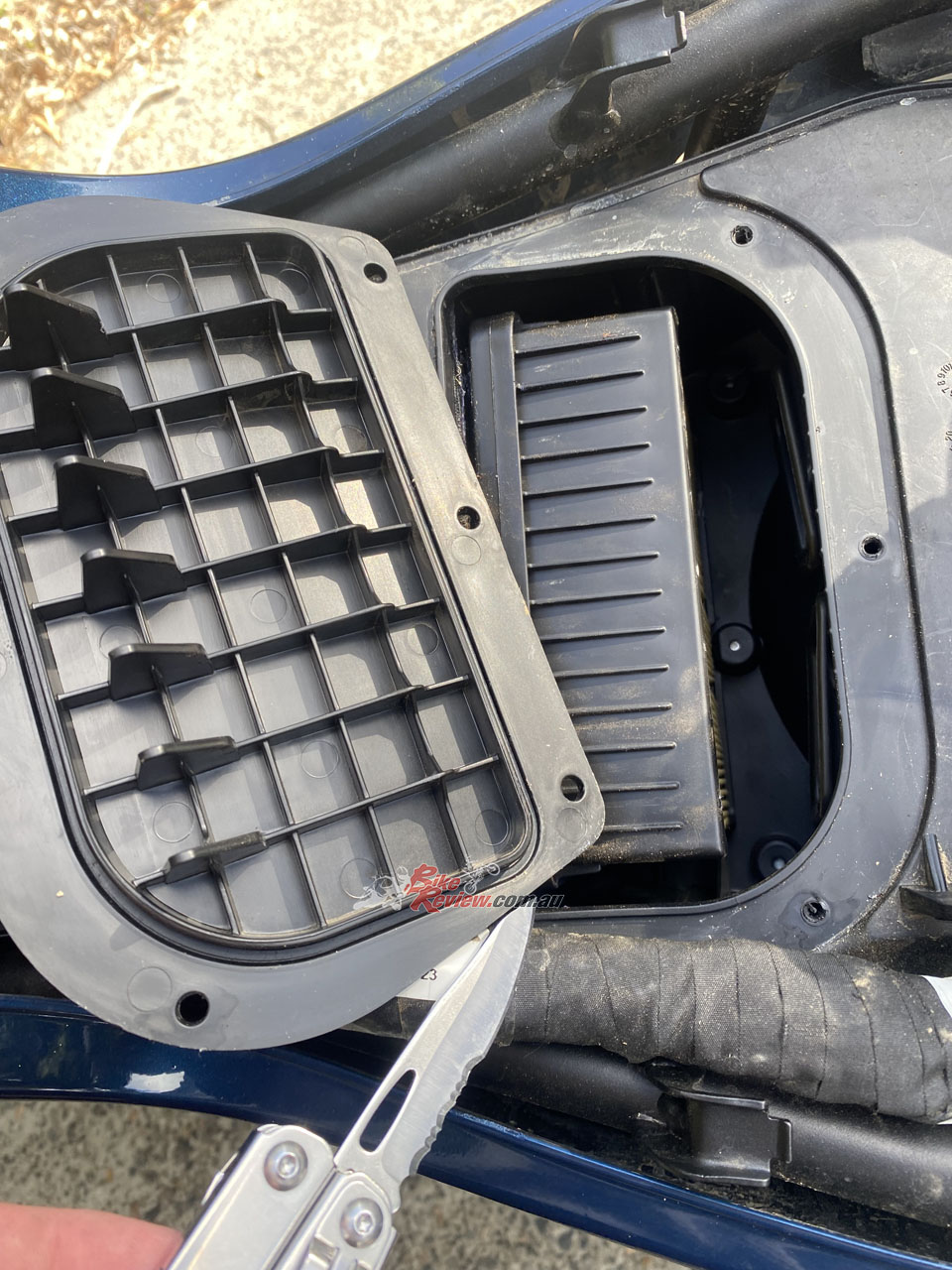 To install, basically reverse all steps. The panel and housing slides directly back down into the airbox, and once the top cover is back on, the panel is firm up against the intake. Tighten the screws back up, being careful not to strip out the soft plastic and then place the seat back on and tighten the two 5mm Allen key bolts. Make sure you’re checking the heated seat connections are still together. Finally, the rear seat clips back in, and you’re set!