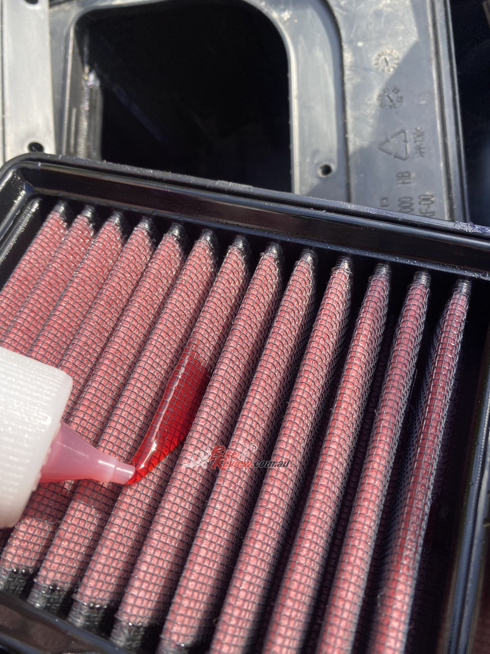 Once the new DNA panel is seated nicely in the housing, I crack open the filter oil. Make sure you punch a decent sized hole in the cap, and snip the top of the bottle with a decent blade. I start running a bead along the ridge of each filter element, until I’m certain that oil had soaked its way through most of the material. After about 5 minutes, I check again and top up any areas that still appear dry. The filter is pre-oiled, but I have some dusty riding planned so added the extra at the expense of airflow. You don’t need to oil the filter if you are not planning anything hardcore.