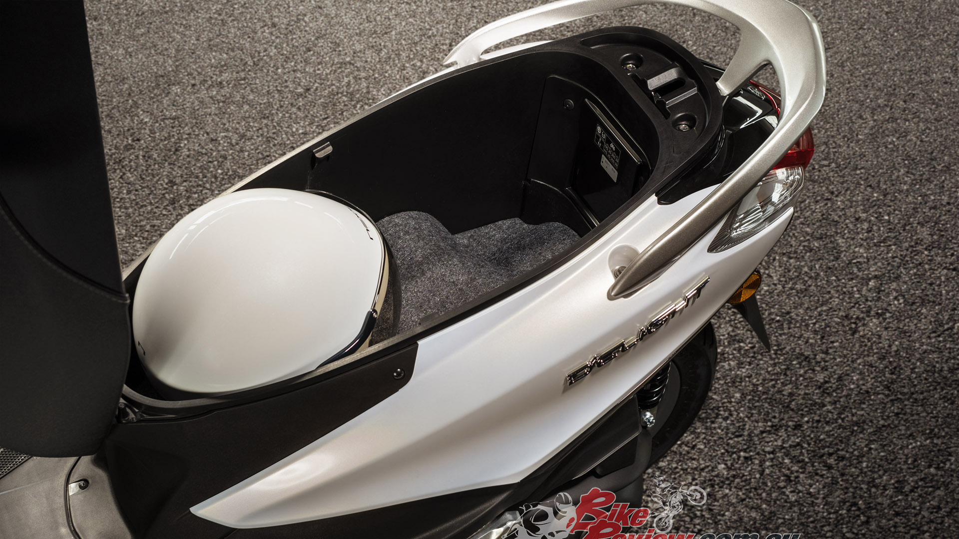 The features that make the D’elight appealing to me include the storage under the seat, which is big for a 125. It fits a full face and loads of stuff. I use a half face Shoei J.O and that fits, plus my RJAYS jacket, DriRider gloves, and there is still room for more stuff, including my Kovix alarmed lock.