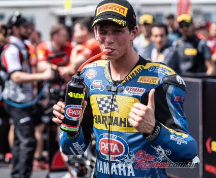 And 23-year old Locatelli’s path to victory was undoubtedly made easier after World Champion Krummenacher (MV Agusta) crashed on lap one. The Swiss hard-charger got off to a bad start and, while attempting to make up for lost time, ran too wide at the unforgiving turn one – his title defence getting off to the same agonising start as Jonathan Rea in yesterday’s WorldSBK opener.