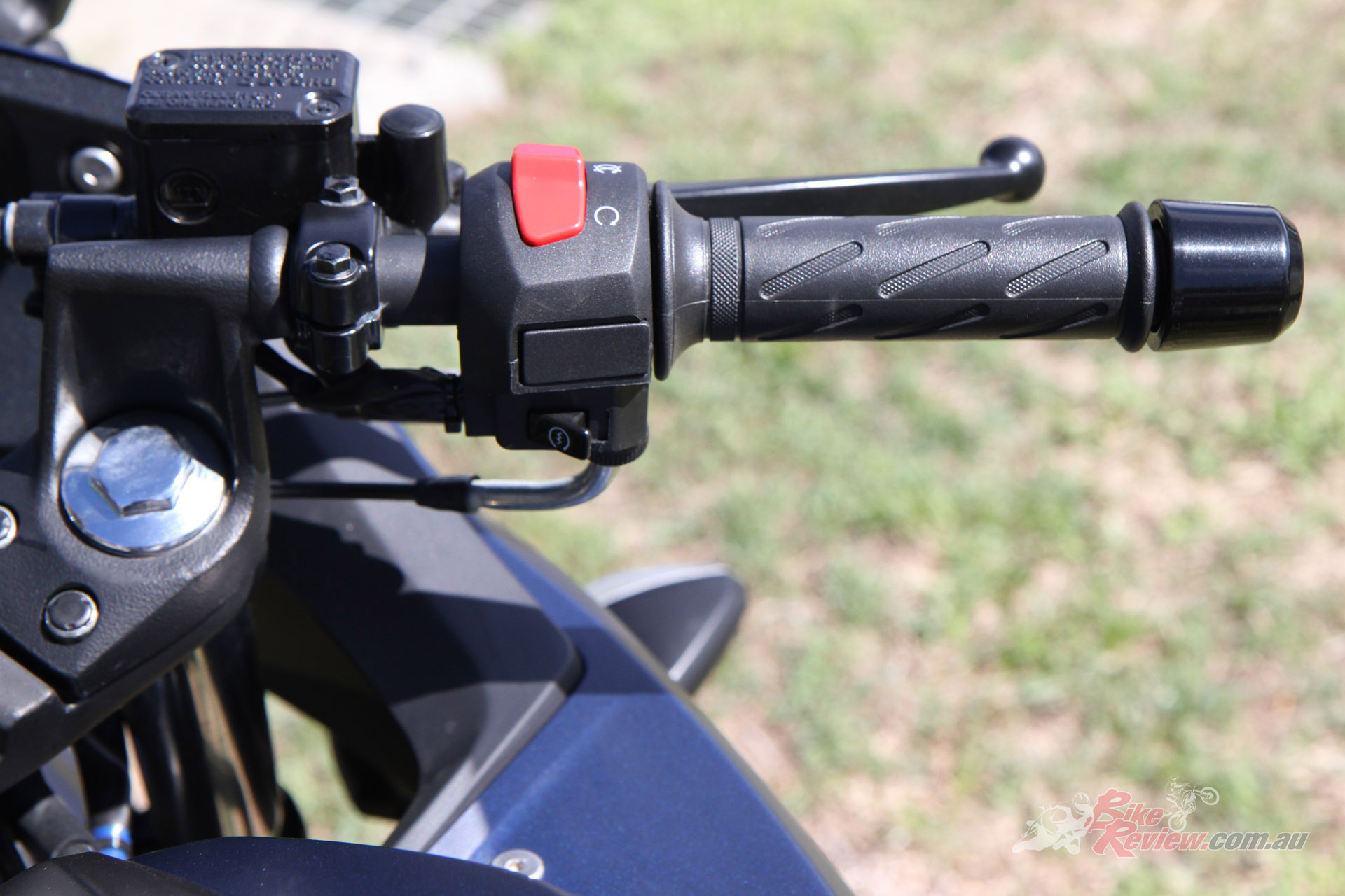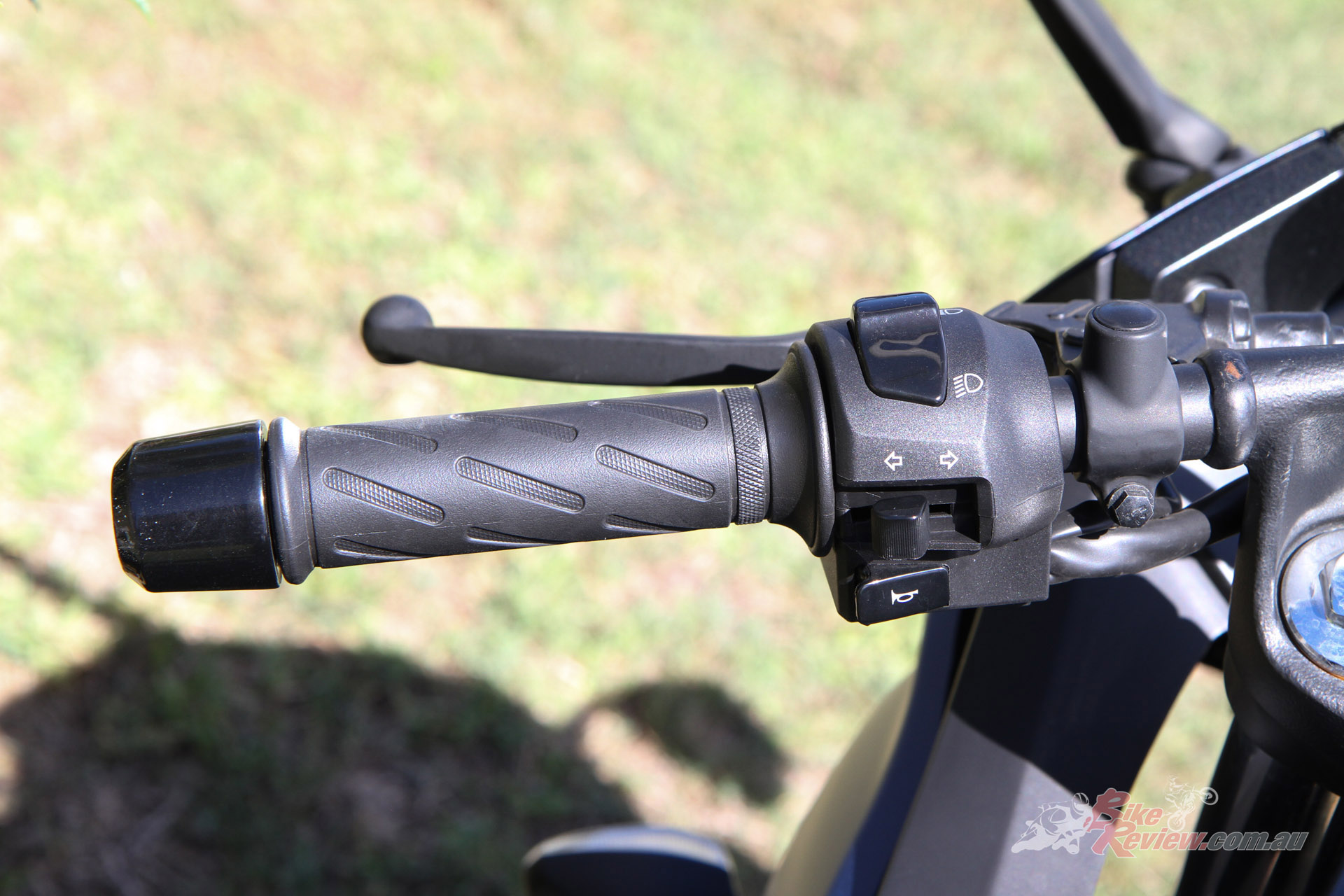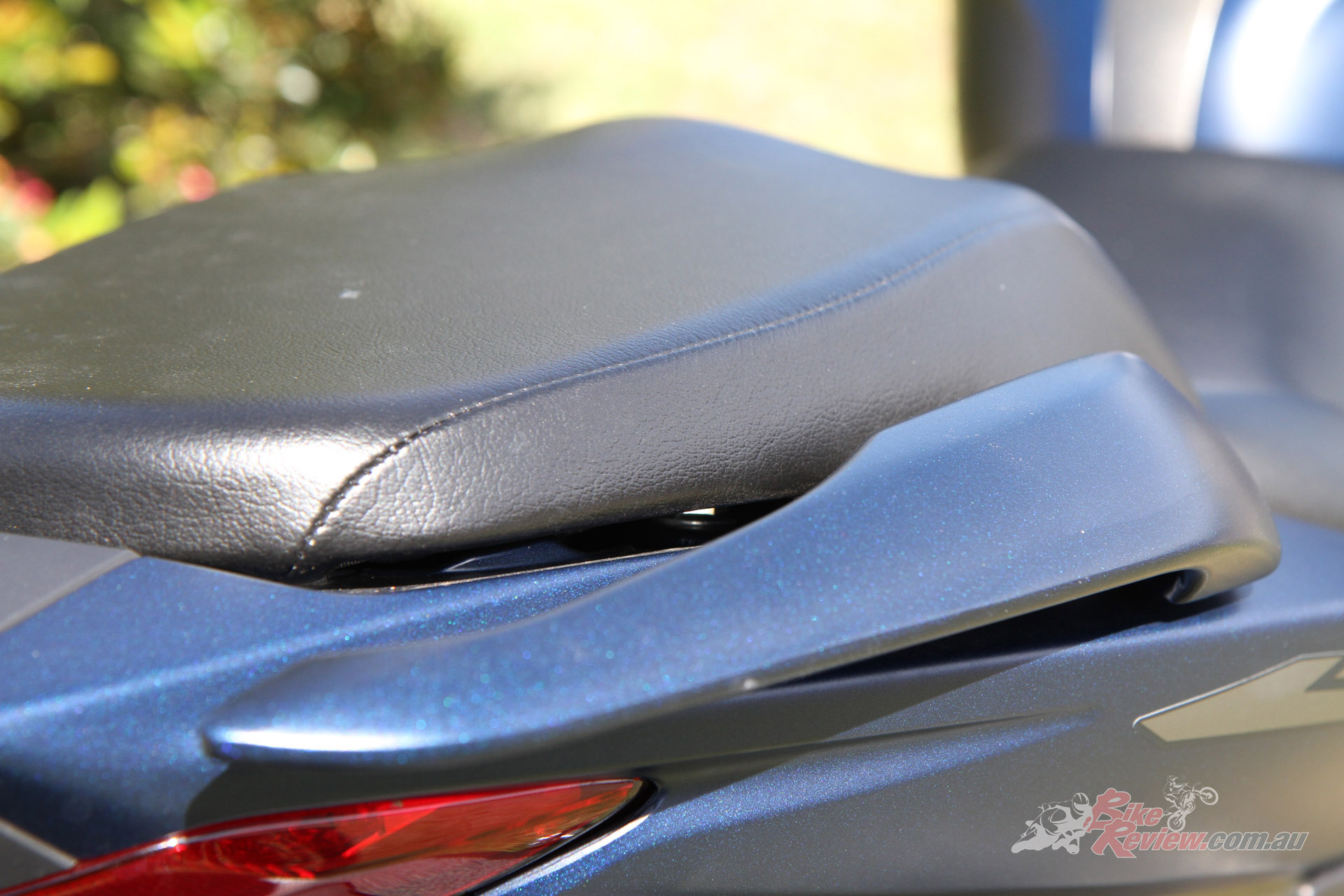 I’m 187cm and it was just right for me, but I felt quite wedged in on the seat in the seat/tank area. Smaller riders will be more comfy but may find the 800mm seat height a little bit tall for them. The pillion seat is a fairly high stadium step up, too. There is a small amount of storage under the pillion seat – a user manual and toolkit are stored there.