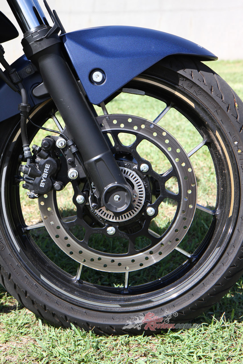 Brakes: Single disc(f) with two-piston ByBre caliper, single disc (r) with single-piston ByBre caliper, ABS.