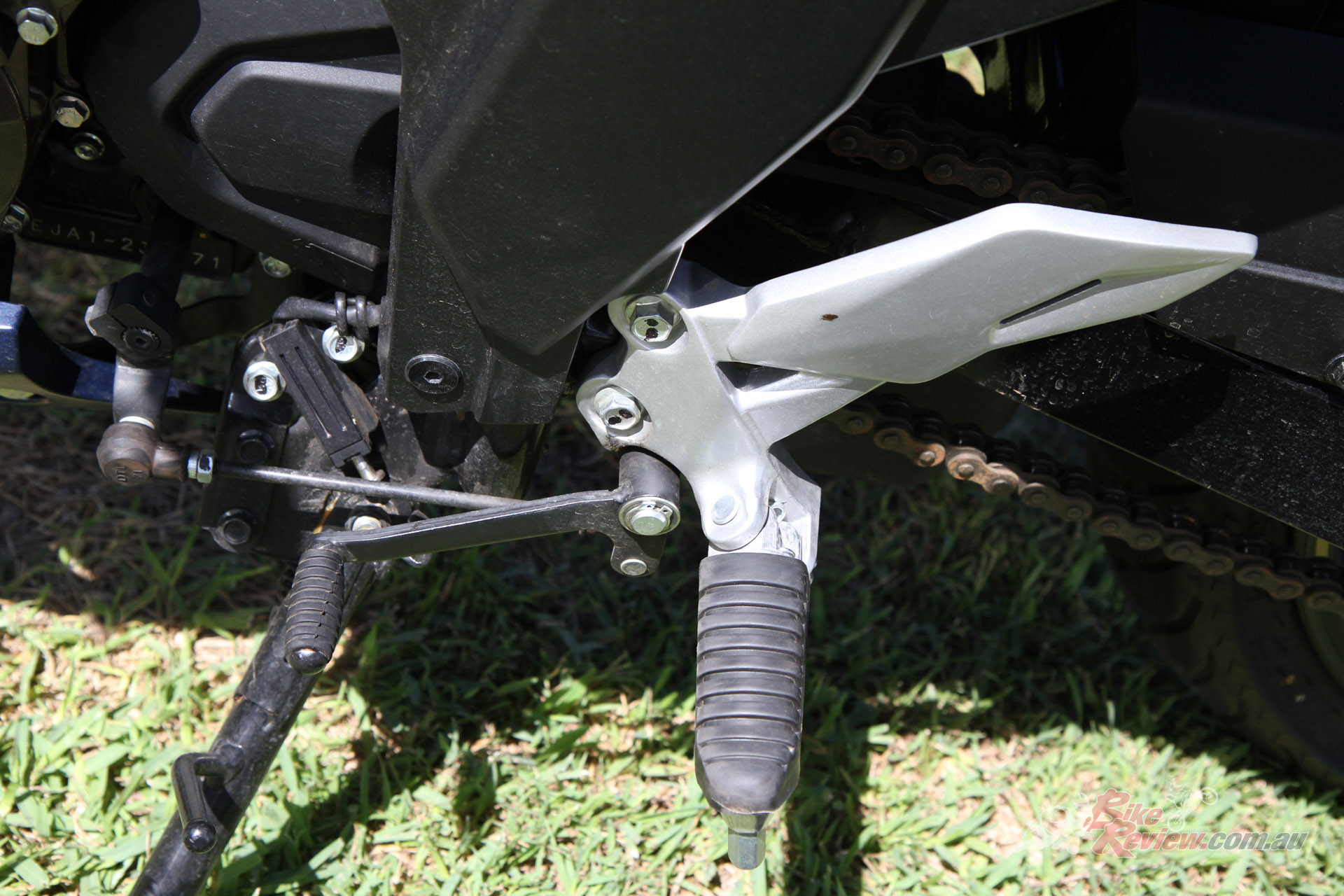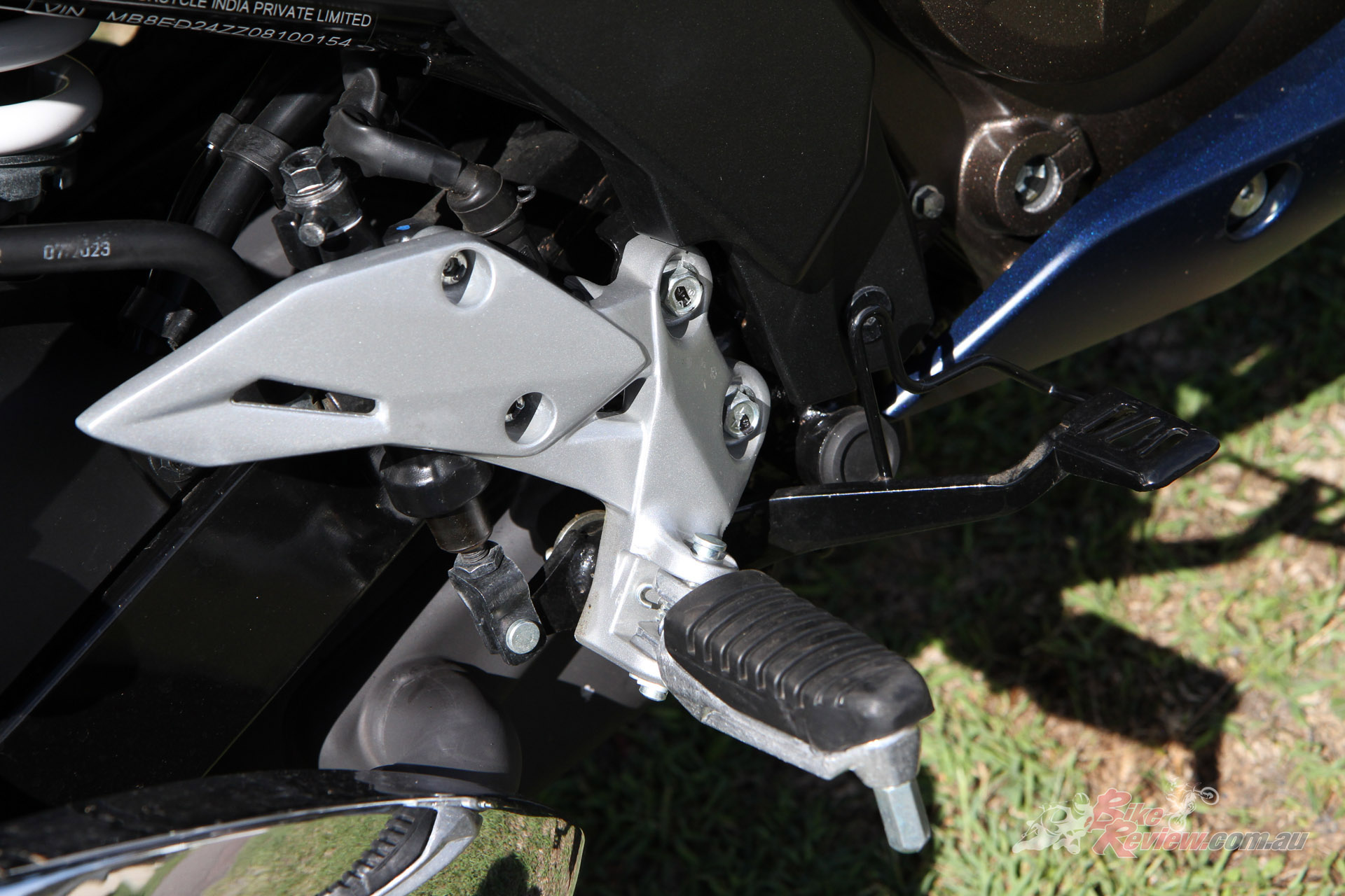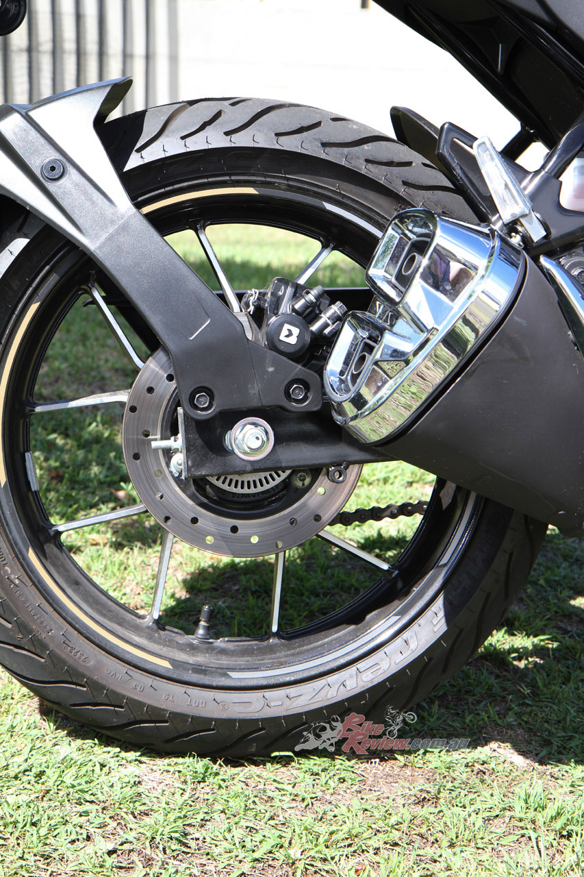 Moving to the back, the rear brake is OK around town but really lacks initial bite and power. It is a tiny disc and small caliper, I would prefer bigger rear brakes. The single shock with preload adjustment (I could not access it actually), is surprisingly on the firm side and the ride height is quite tall. In fact, the bike is high at the rear and the seat height tall for a learner.