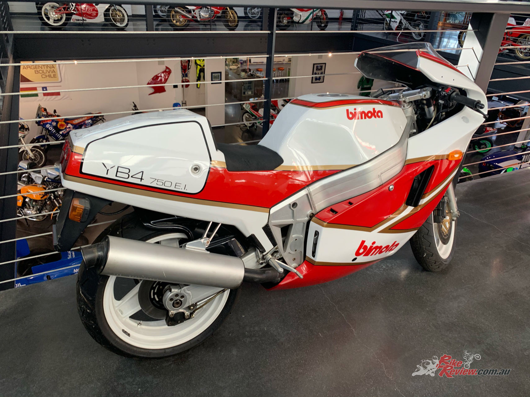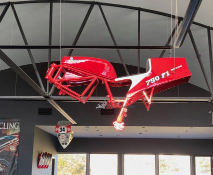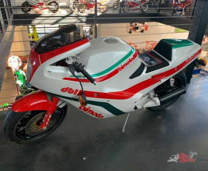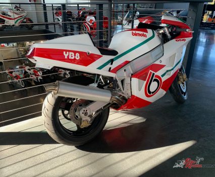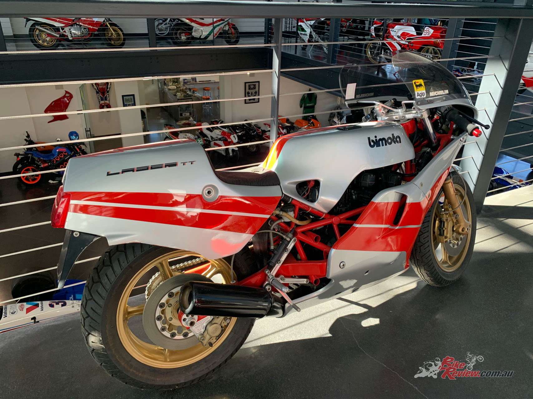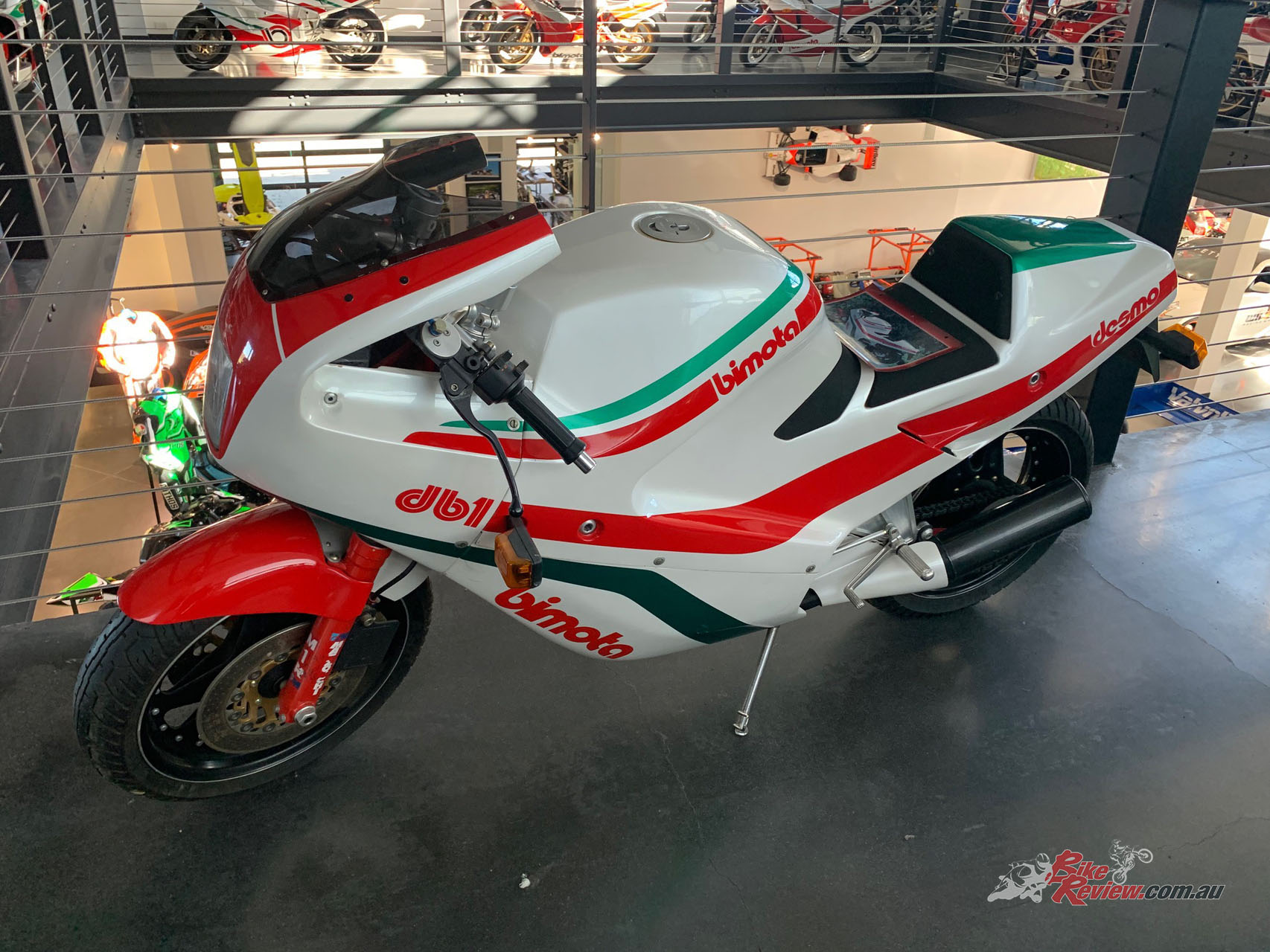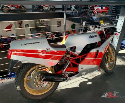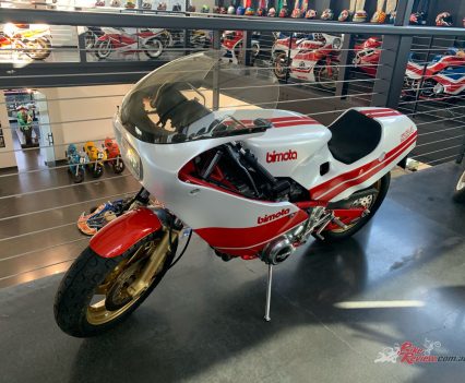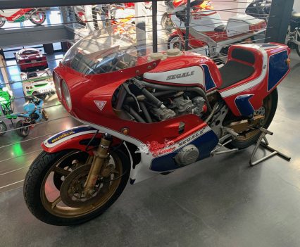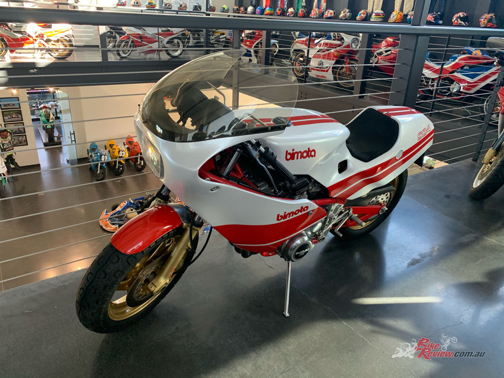 Upstairs placed around the perimeter pathway is the biggest collection of Bimotas I’ve seen. I counted 28 of them ranging from the first generations to the most current and the V-Due 500cc two-stroke model, which sent the storied brand into bankruptcy and the eventual hands of the Kawasaki group.