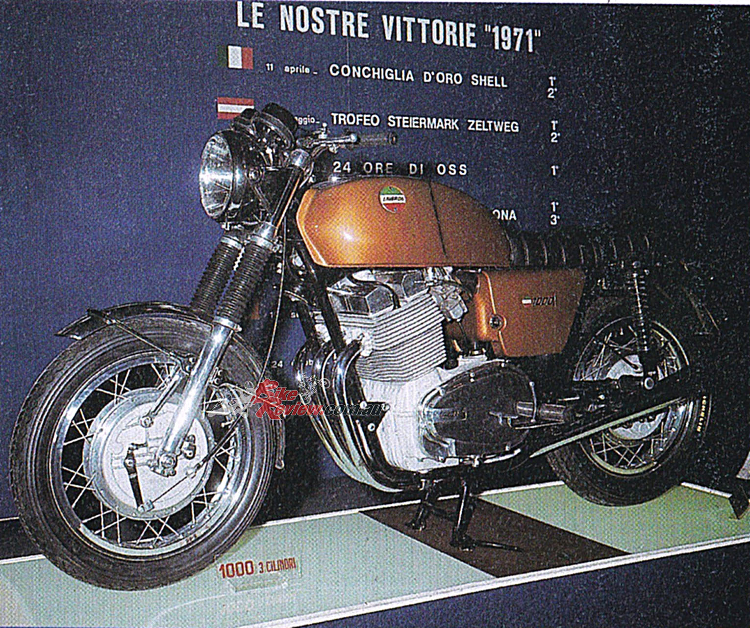 Laverda 3C 1000 debuts at the Milan Show. It produced a claimed 75hp@6,700rpm, good for a top speed of 205 km/h, and sported three separate exhausts, just like Ago’s World champion MV Agusta GP racers.