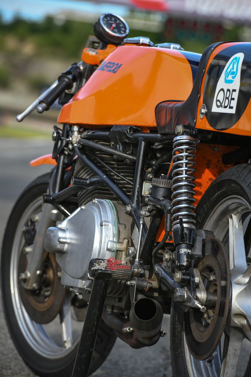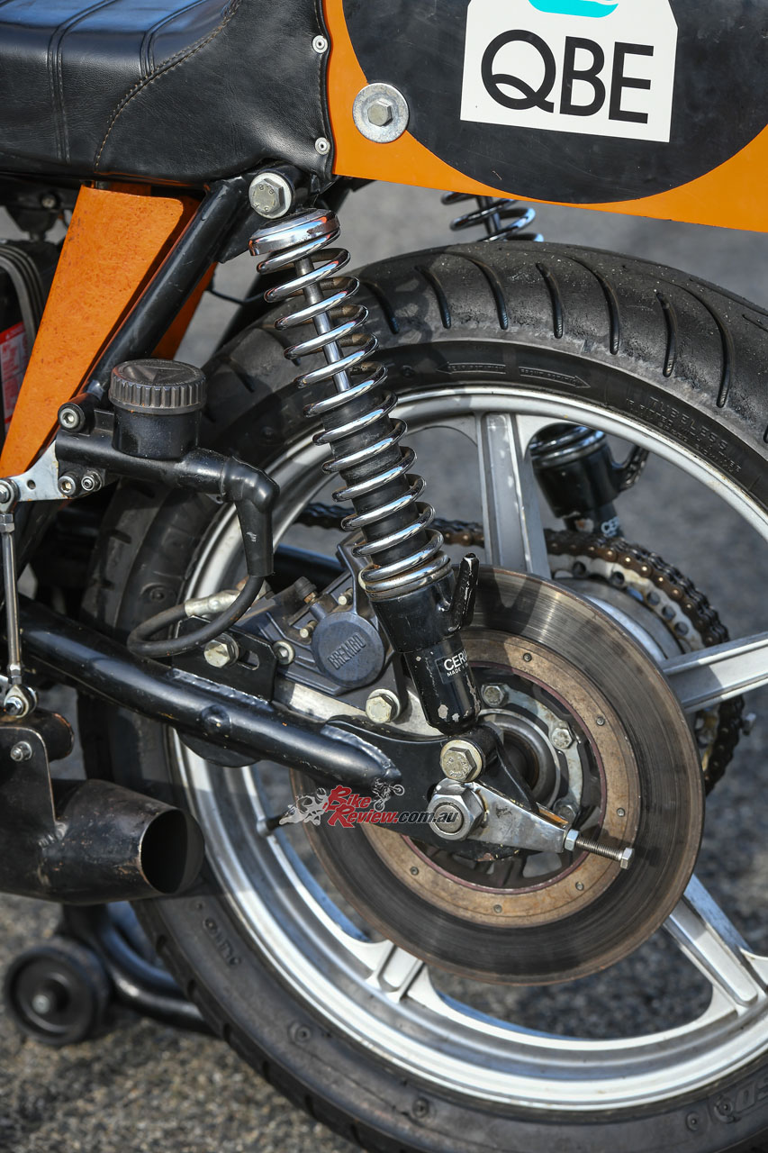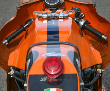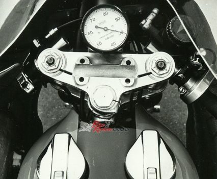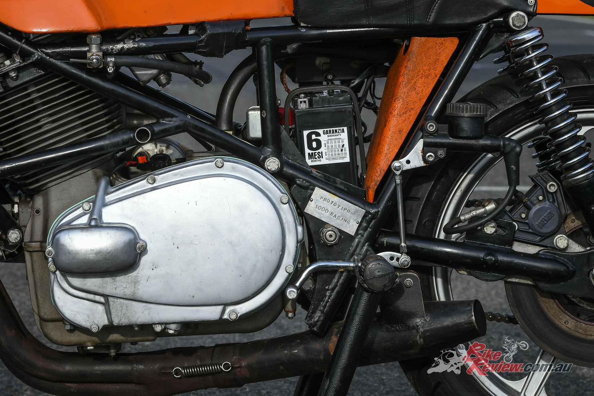 The new chrome-moly tubular steel open-cradle spaceframe chassis employing the engine as a semi-stressed member (which the robust crankcases were well suited to doing), was designed by Luciano Zen, and while at 13kg it weighed 9kg less than the standard frame, it was also 50mm lower and 40mm shorter, too. The 38mm Ceriani fork adjustable for preload and rebound damping sat at a 26.5° rake with 112mm of trail, while the tubular steel swingarm operated twin Ceriani shocks. Wheelbase was 1486mm, with an even 50/50 distribution for the 200.5kg half-dry weight, with oil/no fuel.
