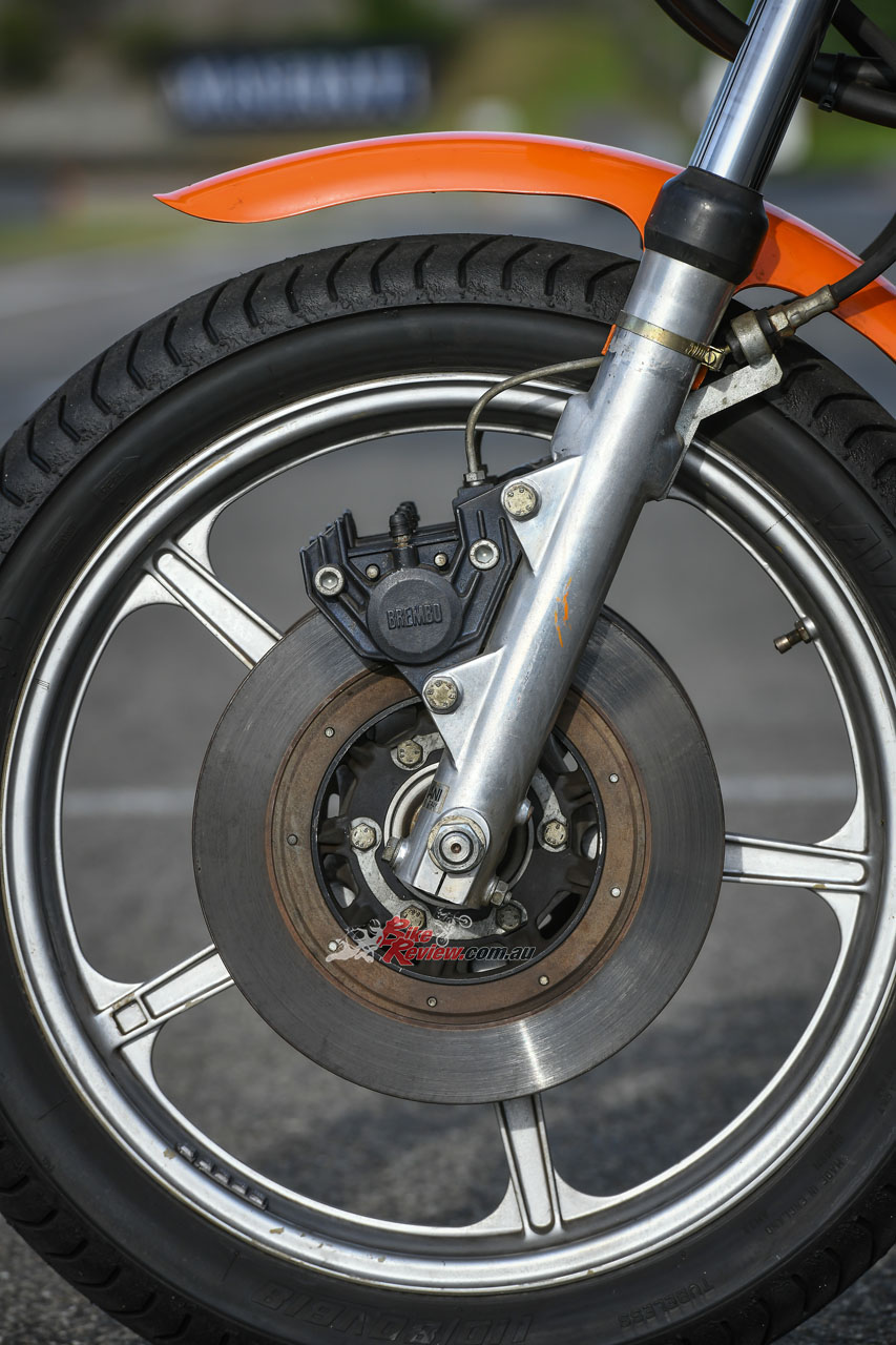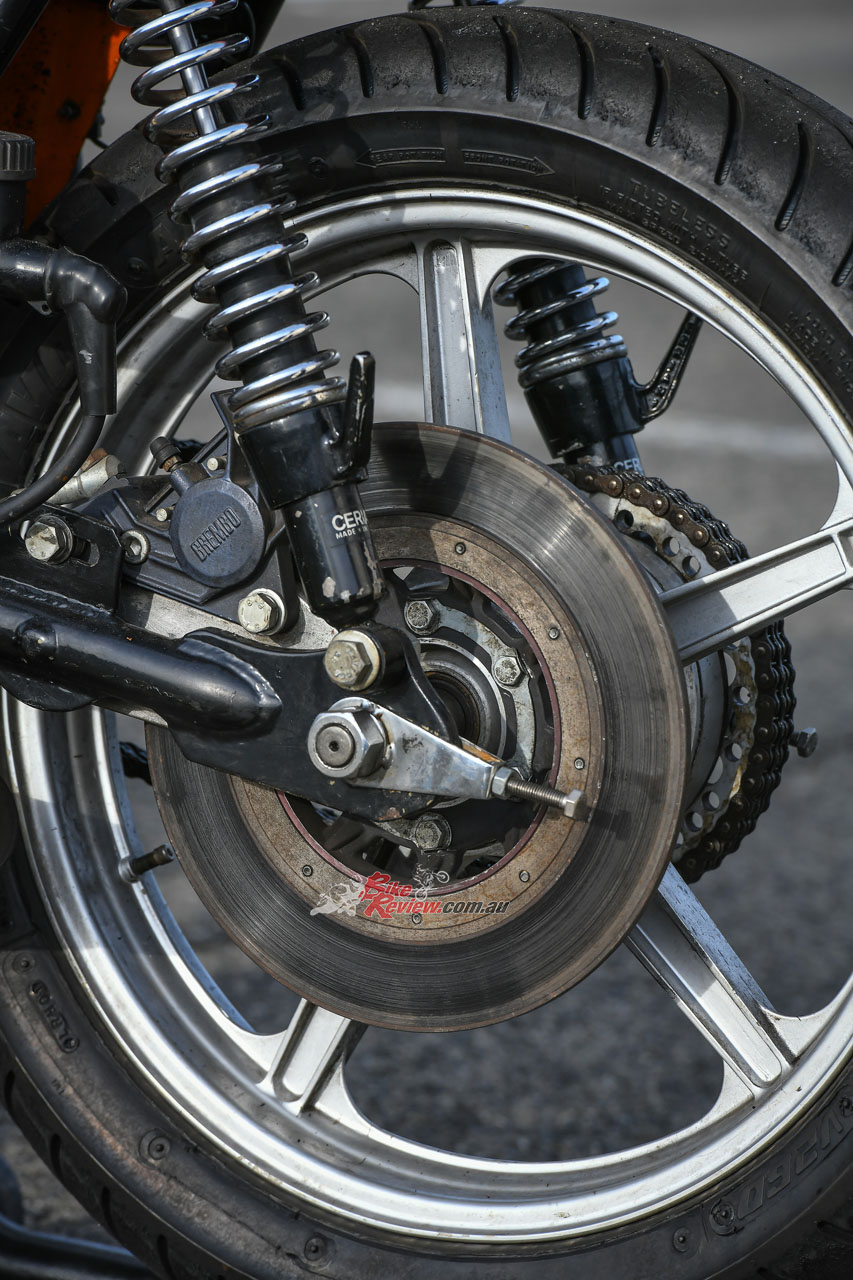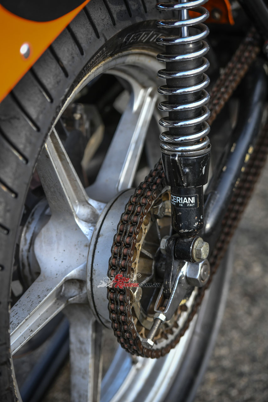 The new chrome-moly tubular steel open-cradle spaceframe chassis employing the engine as a semi-stressed member (which the robust crankcases were well suited to doing), was designed by Luciano Zen, and while at 13kg it weighed 9kg less than the standard frame, it was also 50mm lower and 40mm shorter, too. The 38mm Ceriani fork adjustable for preload and rebound damping sat at a 26.5° rake with 112mm of trail, while the tubular steel swingarm operated twin Ceriani shocks. Wheelbase was 1486mm, with an even 50/50 distribution for the 200.5kg half-dry weight, with oil/no fuel.