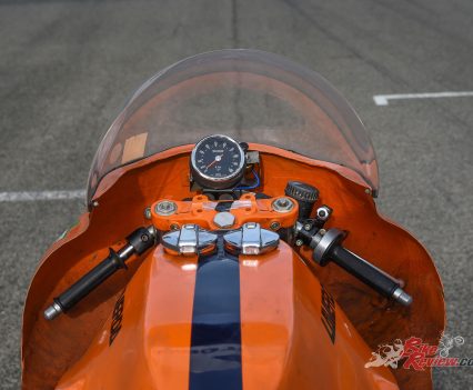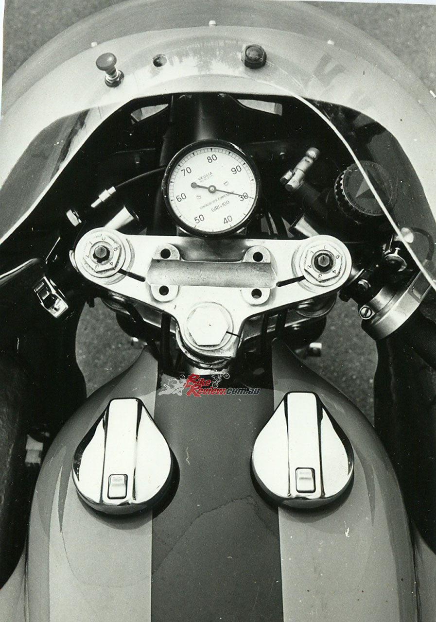 So the plushly padded seat on the Laverda was your throne for the long haul which, coupled with the relatively low footrests denoting a period when the treaded tyres didn’t permit excessive angles of lean, makes you feel wedged in place, unable to move around the bike thanks to the close-coupled riding position. Just get ready to tuck yourself behind the broad fairing and rest your elbows on the wide, flat fuel tank with its twin filler caps as you tackle those long straights at Spa or Mugello, while that so-distinctive engine beats away seemingly unburstably beneath you.