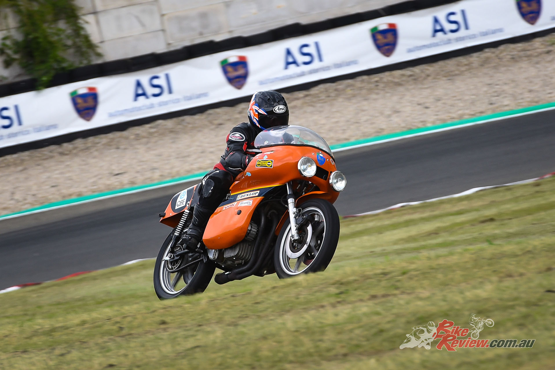 Such a circuit is quite unlike the fast, open courses like Spa and Mugello that the heavy, robust Laverda 3C long-distance express was most at home on, and it didn’t help that it was way overgeared for Varano, since to avoid changing sprockets the Laverda family leaves the tall Spa-Francorchamps gearing on for their annual visit to the Bikers Classic event there, and makes do with it elsewhere.
