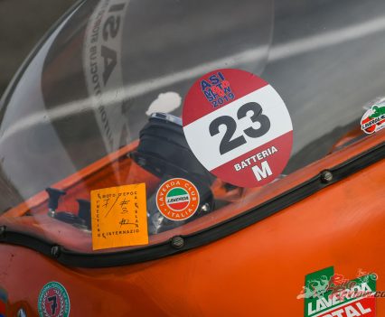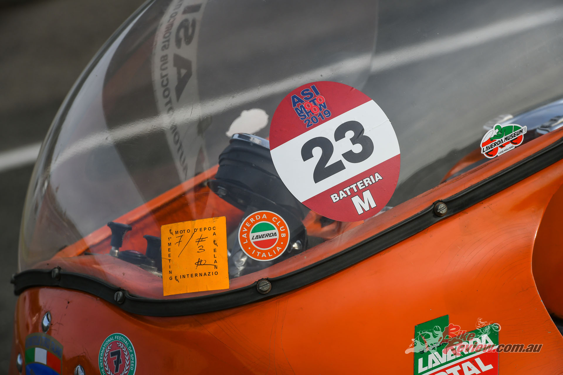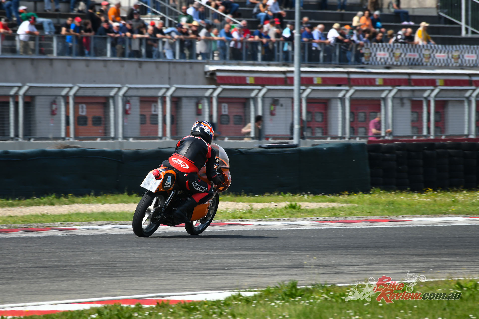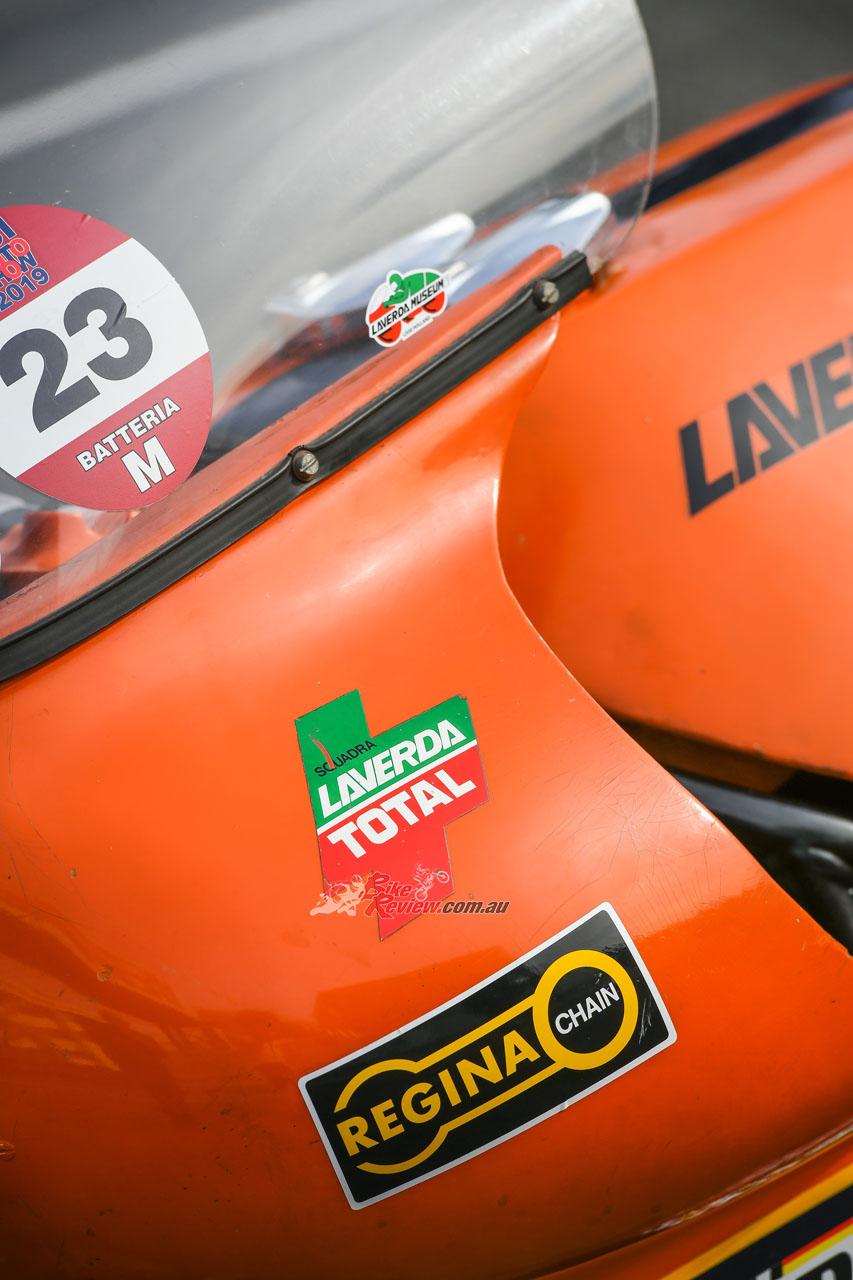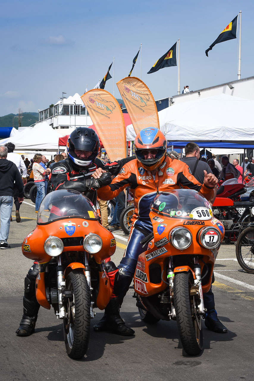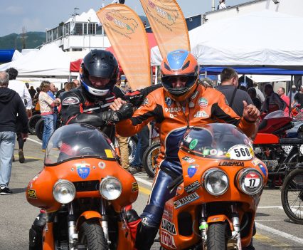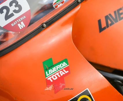 My chance to experience these extra kilos from the hotseat came at Italy’s annual Moto Storiche festival at the Varano circuit in the hills outside Parma. There, one section of the Paddock becomes a sea of orange each year, as Laverdisti from all over Europe congregate to celebrate in action the memory of Italy’s most famous Endurance racing brand, now sadly defunct while its trademark’s owner Piaggio continues to rebuff attempts by well-funded firms like Fantic to purchase it from them, and relaunch the brand.