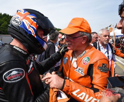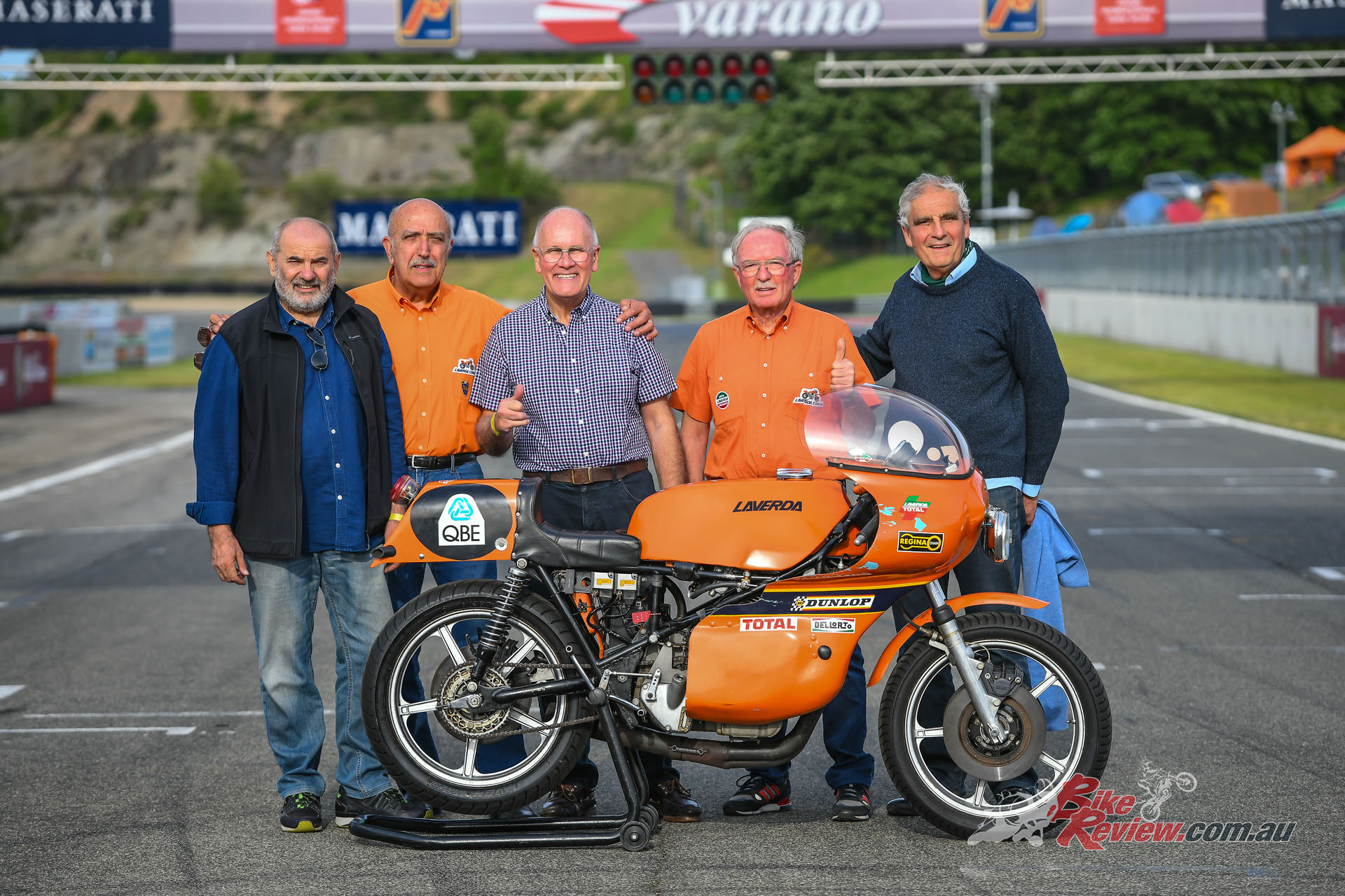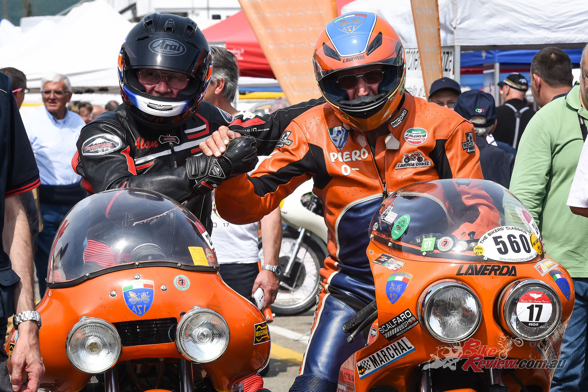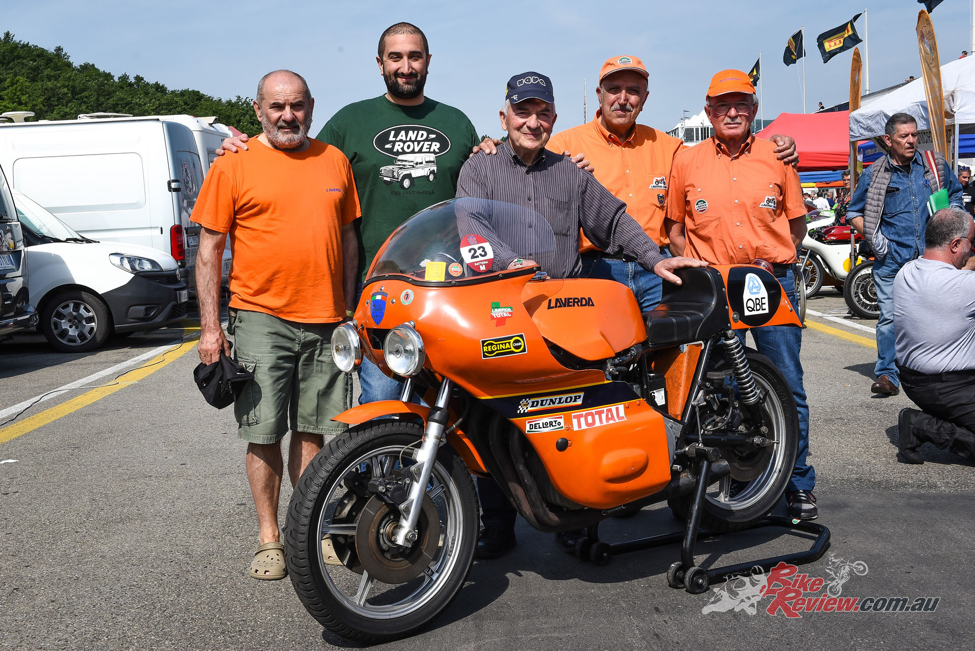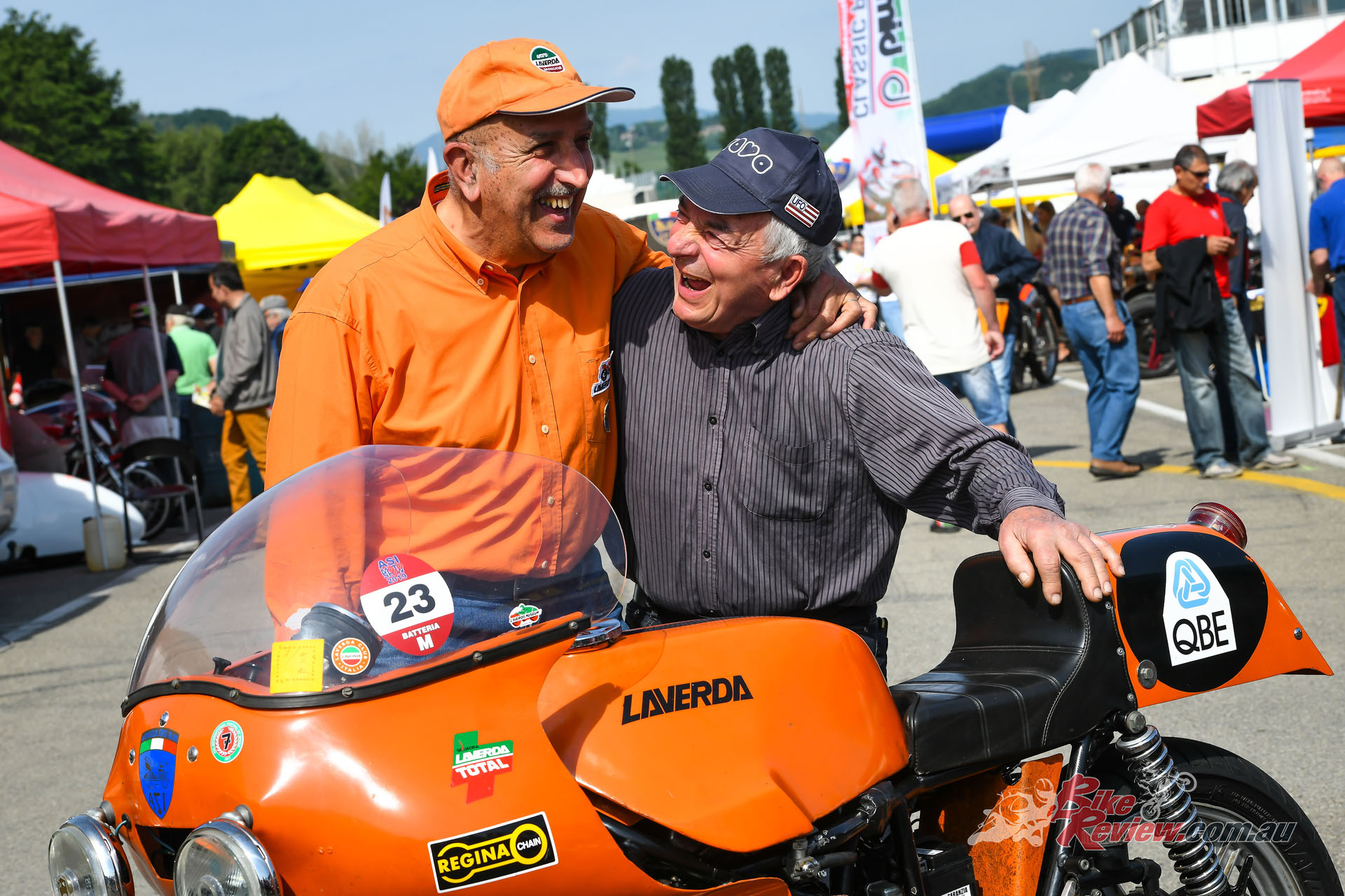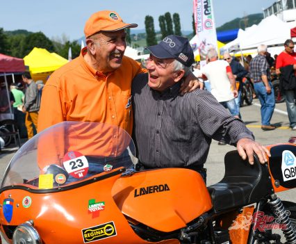 Piero Laverda and son Giovanni had brought both the legendary V6 for Piero to demo, and the 3C Spaceframe which Giovanni normally rides. But this time he gave me the honour of two sessions on the busy 12-turn 2.38km Varano circuit aboard a bike whose engine remains essentially untouched since it was built up in 1976 after Laverda had retired from racing, ready for display in the factory lobby until the company closed in 1985, and the Laverda family retrieved it for their private collection. In deference to this, I was asked to keep revs down to 6,000rpm, rather than the 8,000rpm the watching Roberto Gallina told me he usually observed in 24hr marathons.
