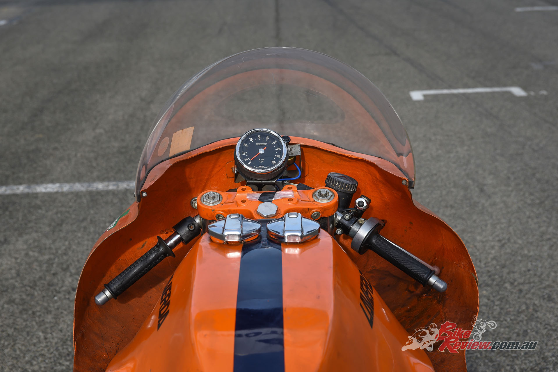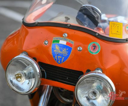 Twin 280mm Brembo cast iron discs with two-piston calipers were fitted up front, and another at the rear, with 18-inch Borrani wire wheels, and Dunlop rubber. That weight not only included the alternator in front of the cylinder block, with a polished alloy cover over the belt-drive running off the crank, but also the twin SEV-Marchal 100W headlamps parked either side of the letterbox slot in the all-enveloping fairing, feeding air to the oil cooler positioned in its nose.