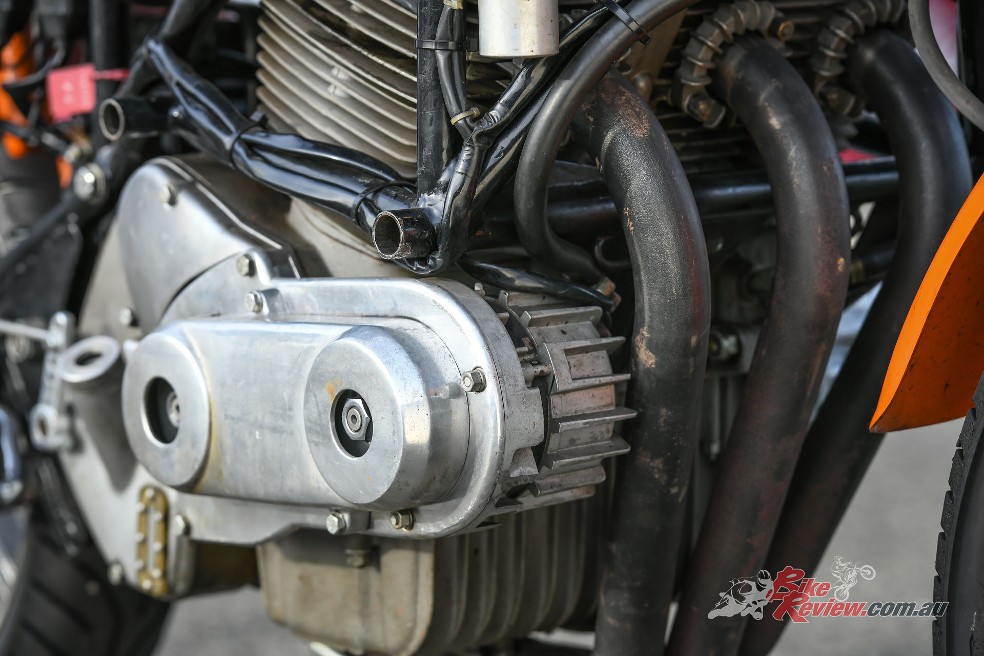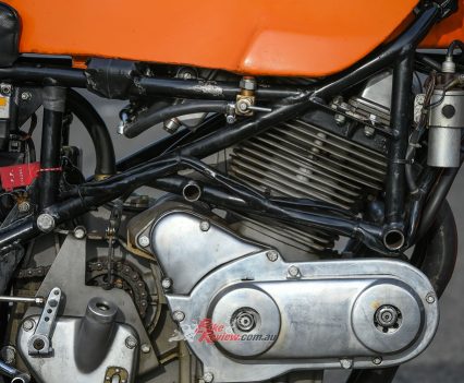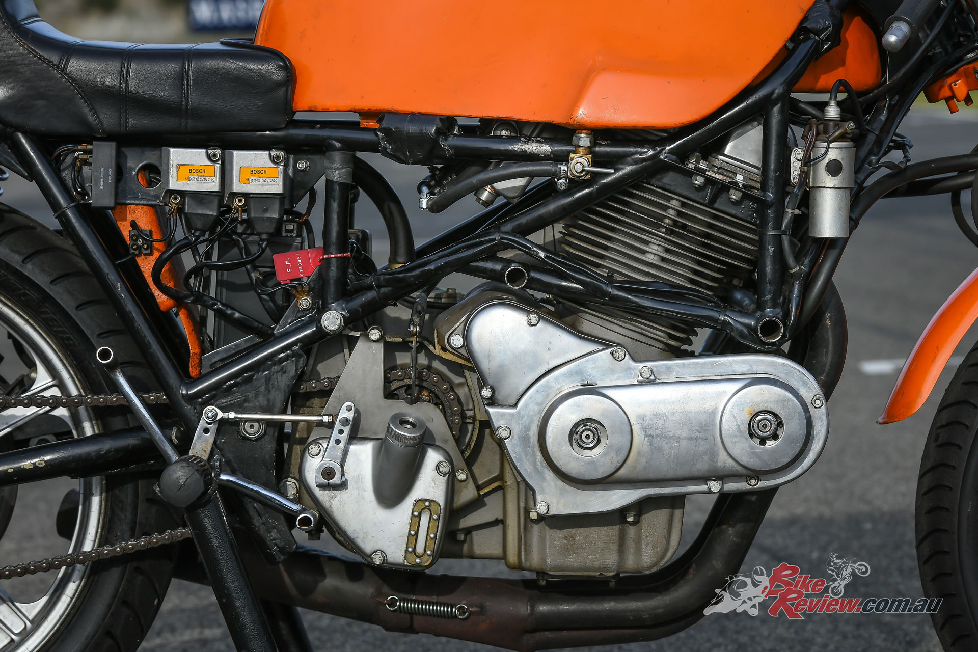 As development got underway in 1970, the Laverda motor’s top end evolved into a DOHC format with shim-and-bucket adjustment, but the same offset camdrive now via a toothed belt, before switching in 1971 to a more compact design. This saw the robust one-piece cylinder block inclined forward by just 20° (versus the twin’s 25°), and a single-strand camchain positioned between cylinders 1 and 2 starting on the right as viewed from the rider’s seat.