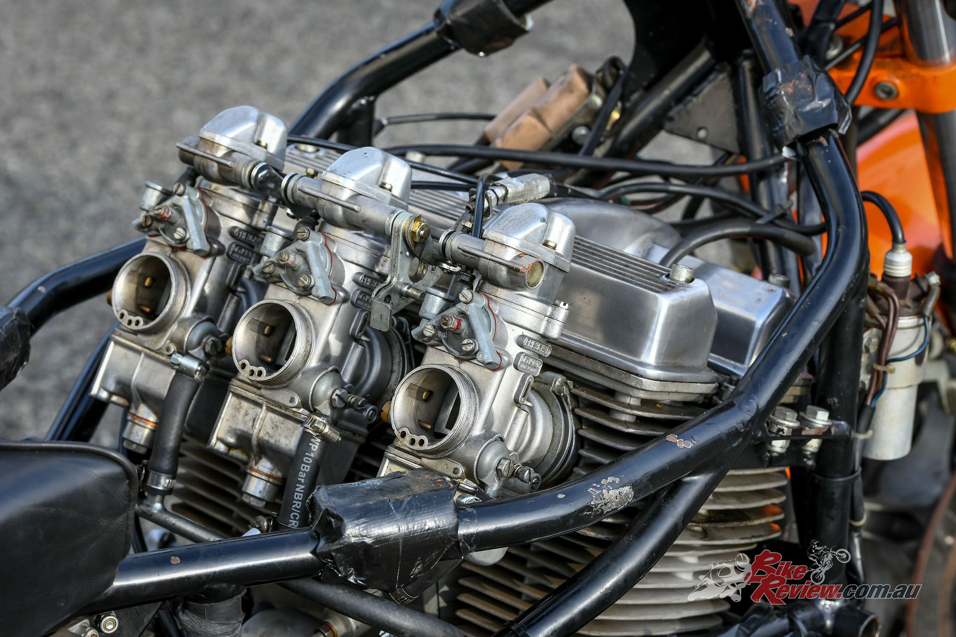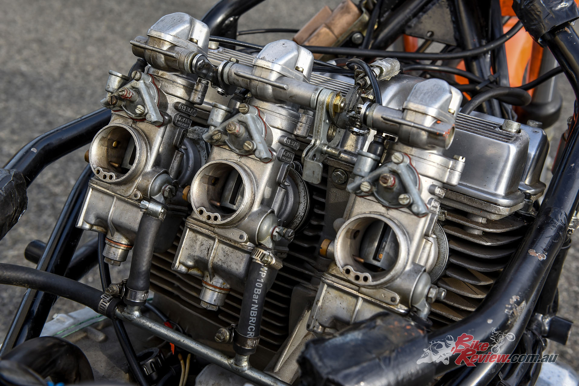 ENGINE: Air-cooled DOHC three-cylinder in-line four-stroke with 180° crankshaft, chain camshaft drive, and two valves per cylinder (40mm inlet/35.5mm exhaust), 75 x 74mm bore x stroke, Bosch BTZ electronic CDI with belt-driven alternator, 3 x 36mm Dell’Orto PHB, 5-speed close-ratio, 13-plate oil-bath clutch with triplex chain primary drive and duplex chain final drive.