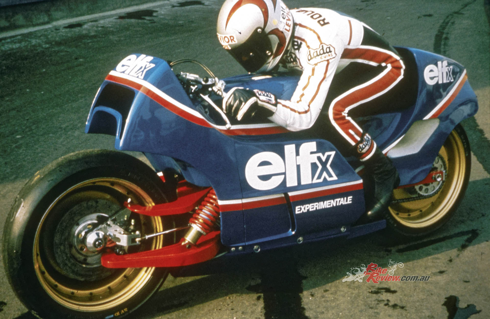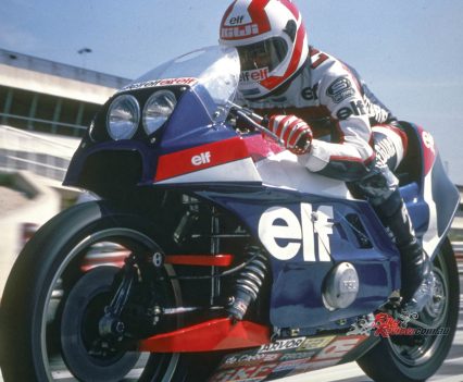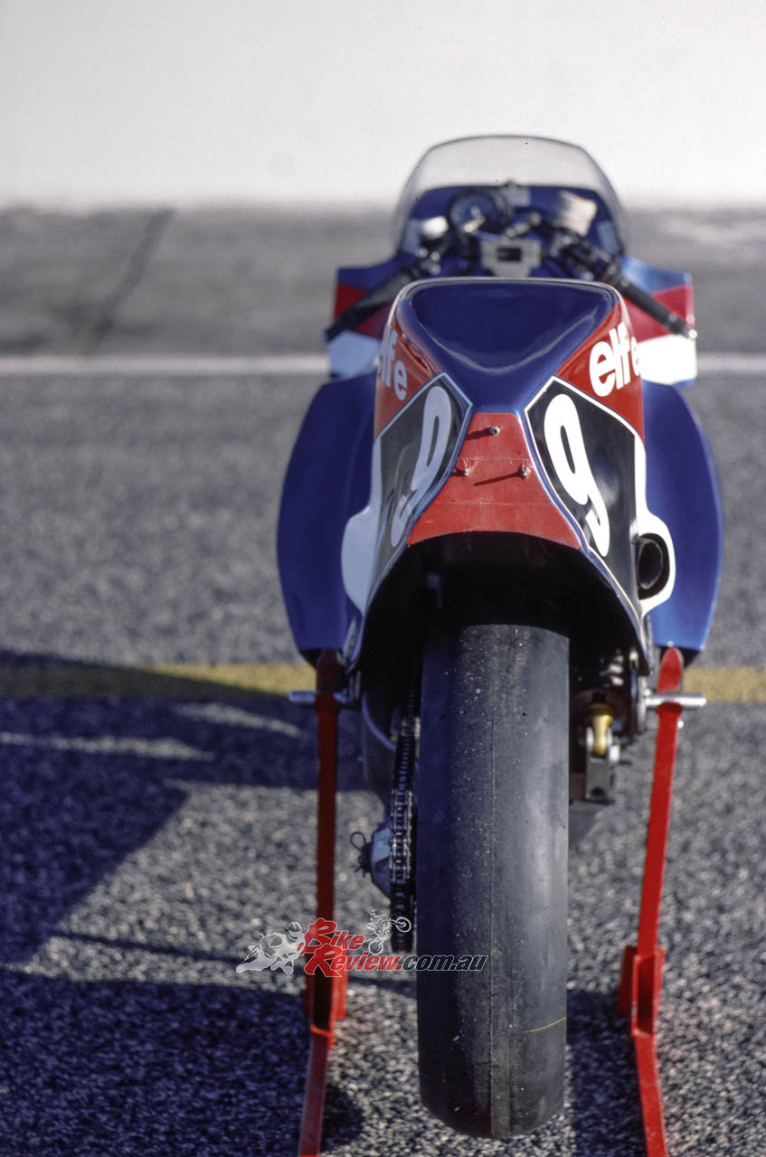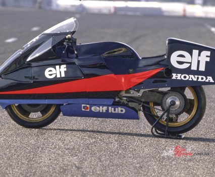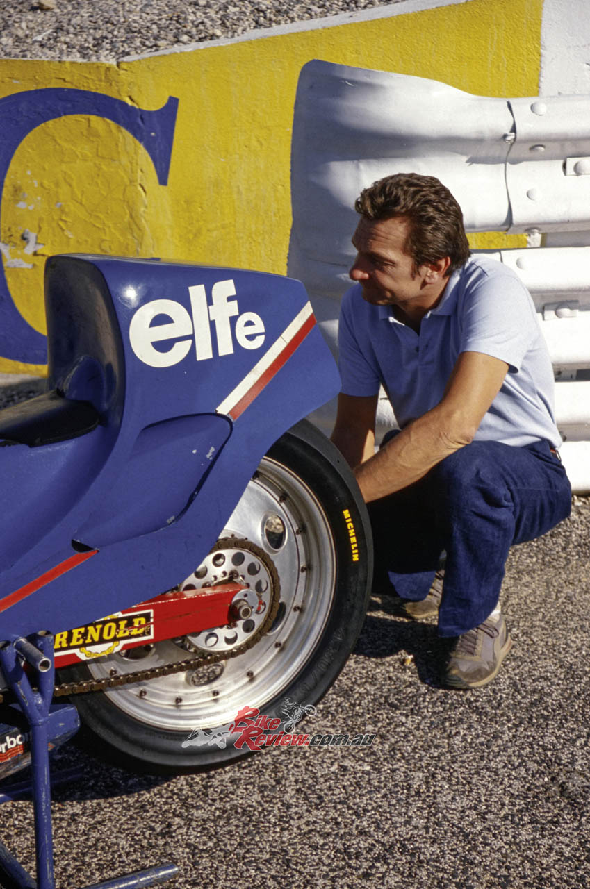 1978: ELF commissions French car designer André de Cortanze, an enthusiastic biker, to build a radical hub-centre racer powered by a Yamaha TZ750 two-stroke motor, known as the ELF X. It’s only raced once, but the enthusiastic public response dictates a follow-up.