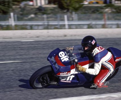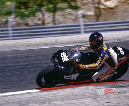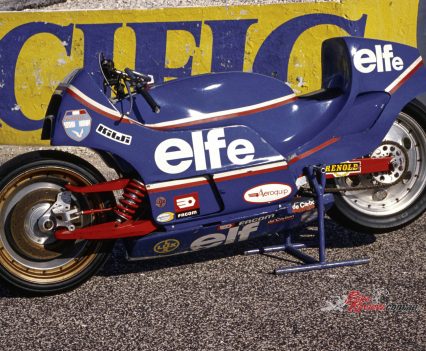 1984: ELF switches to 500cc GP racing with another hub-centre de Cortanze design, the ELF2, powered by Honda’s NS500 two-stroke triple and equipped with a unique push-pull steering design. But this is hard to become accustomed to, and the bike is not a success.