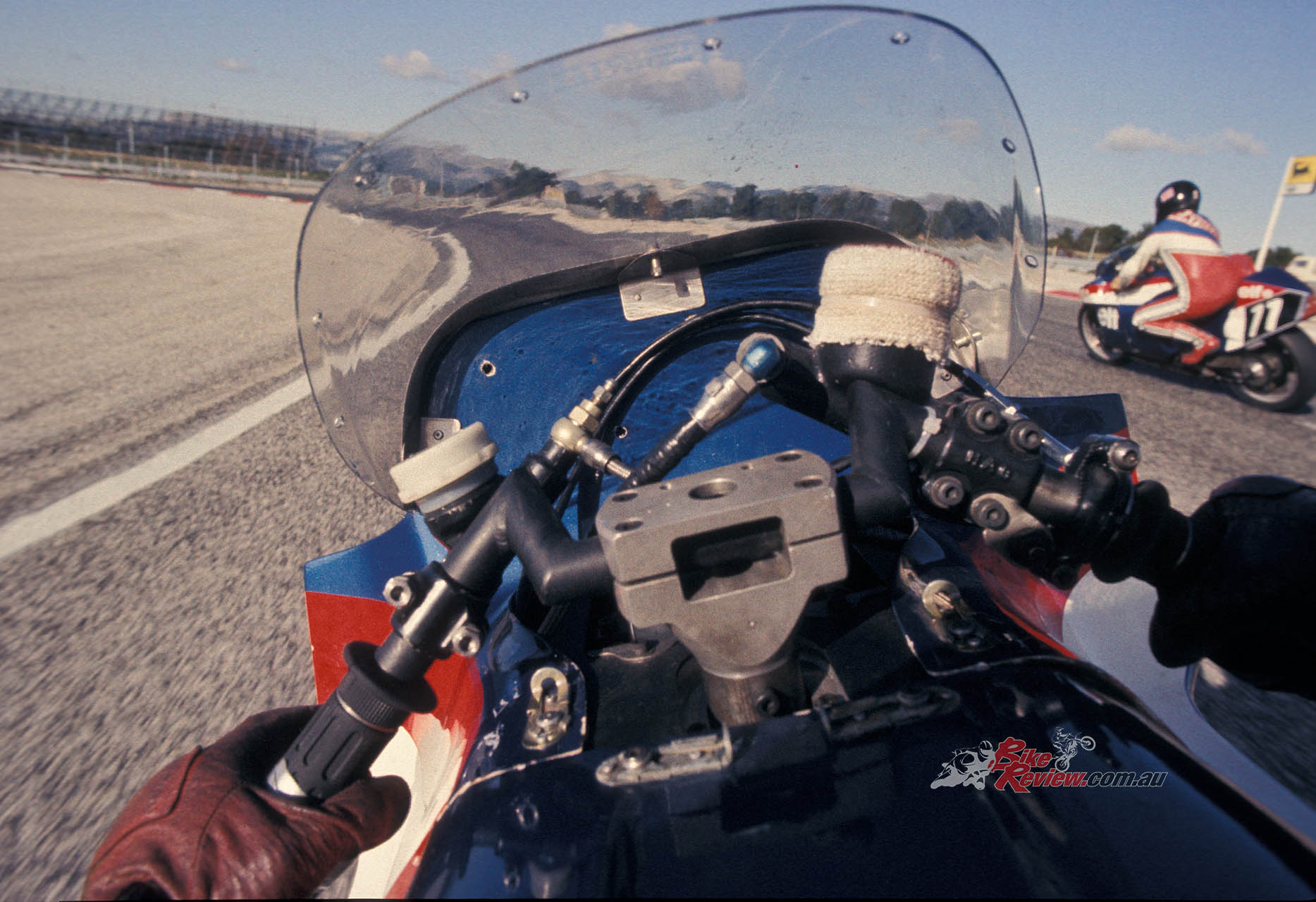 A problem associated with carbon discs is that they hardly work at all when cold, a fact I almost discovered the hard way when I gripped the brake at the end of the Mistrale straight on my first lap on the bike – and nothing happened! Back in the pits Walter Villa offered sympathy: “The first time I rode it the same thing happened to me! What you must do is ride along for the first 200 metres holding the brakes on – that warms them up!”