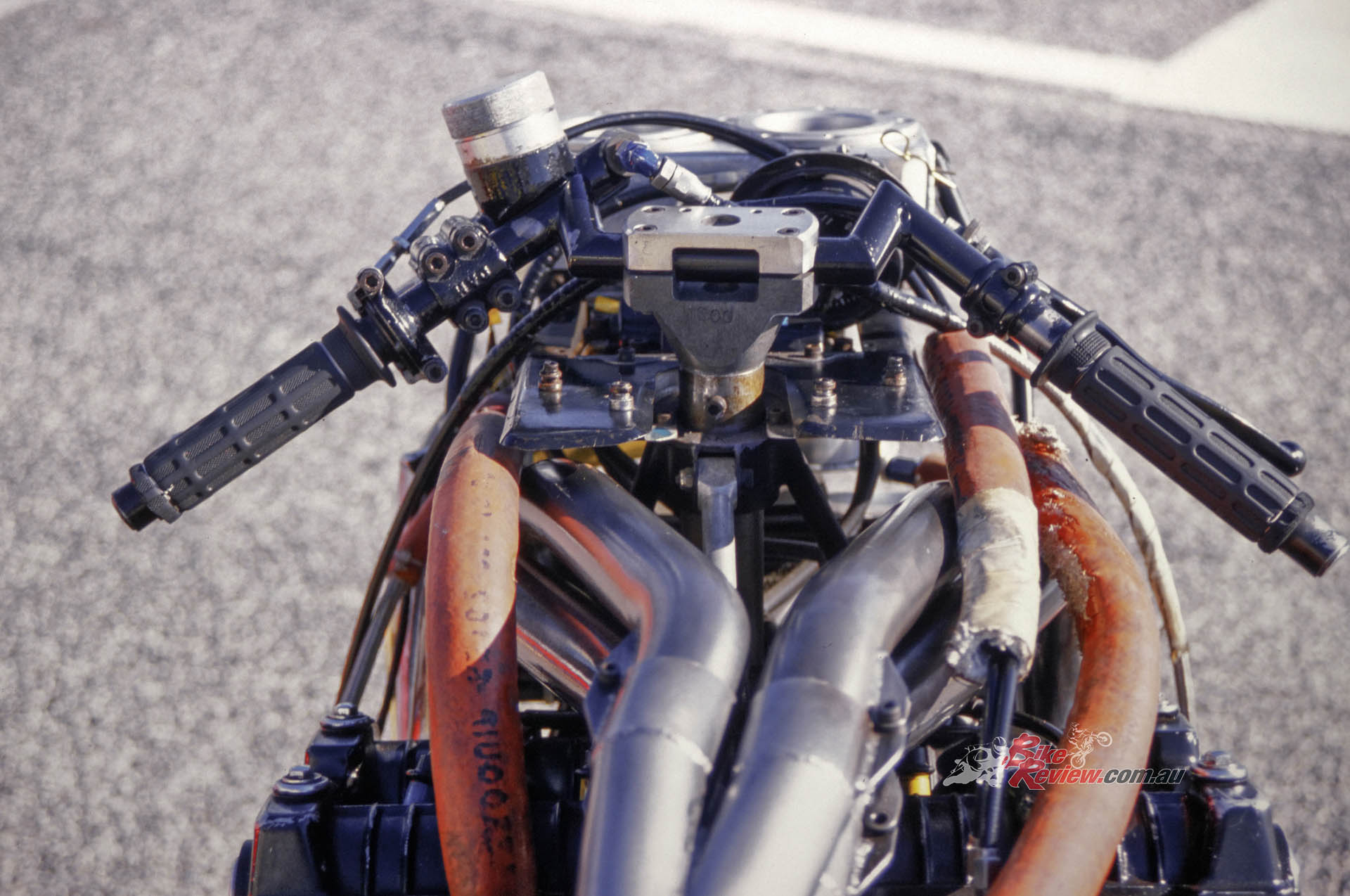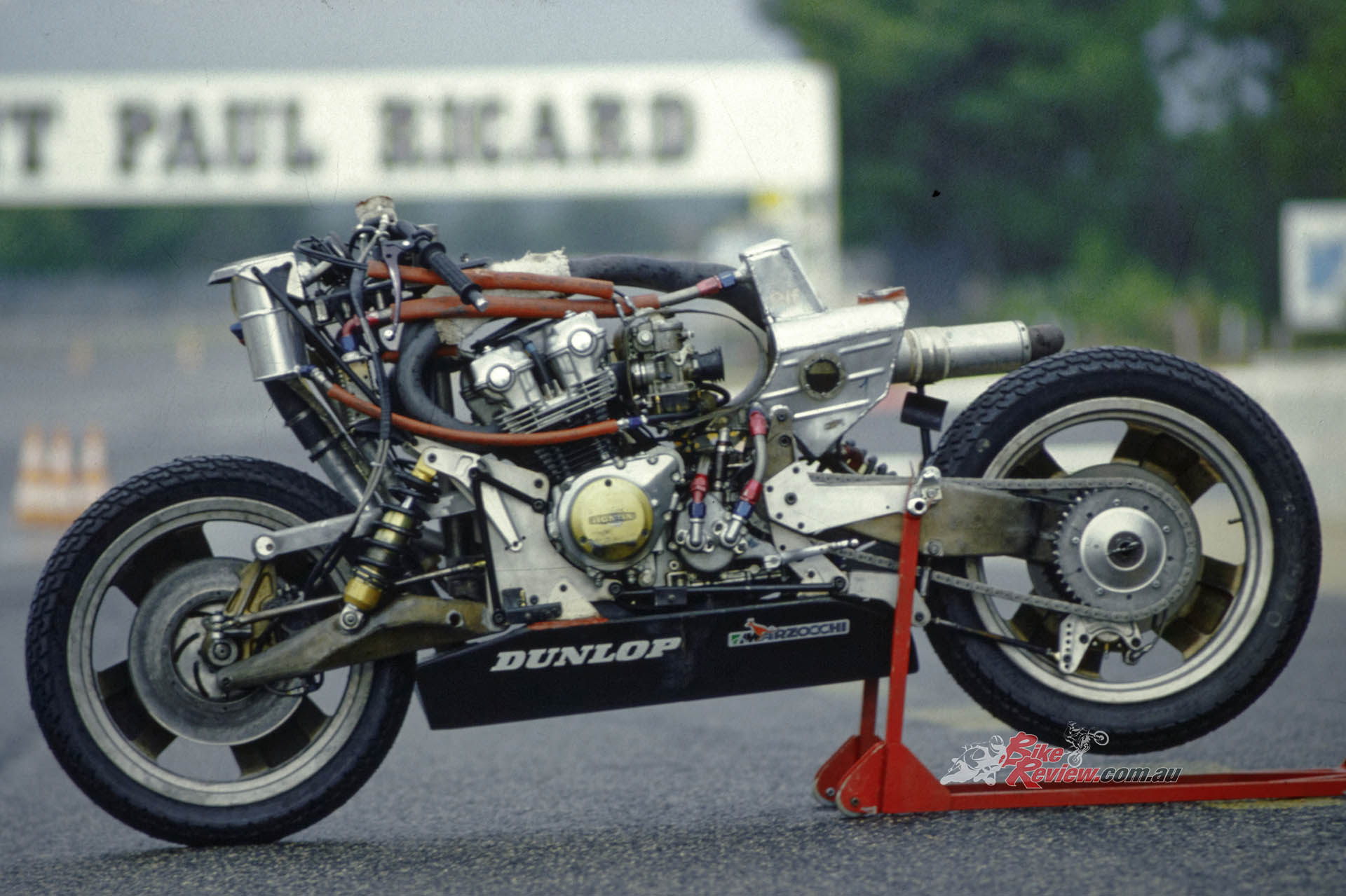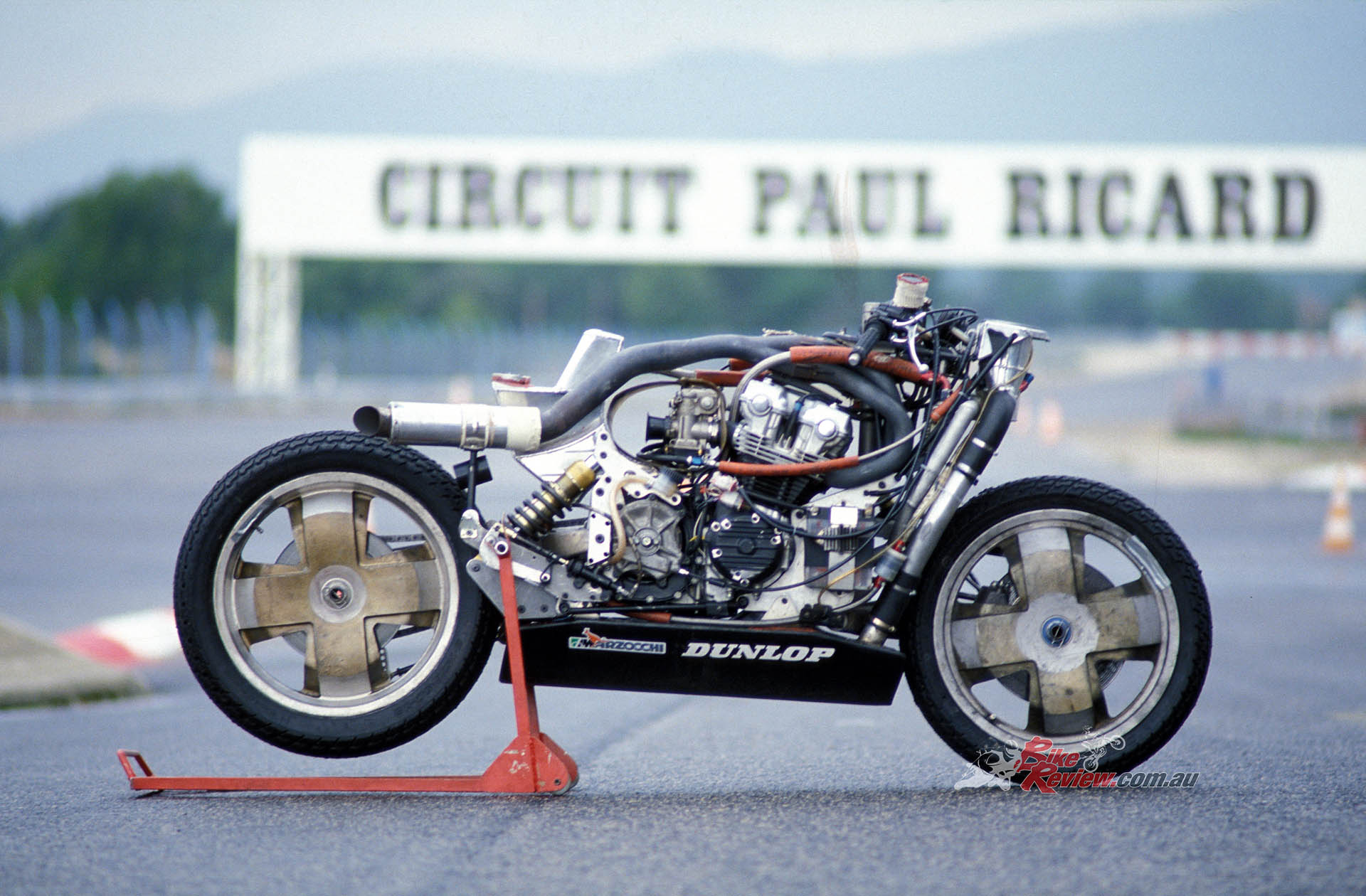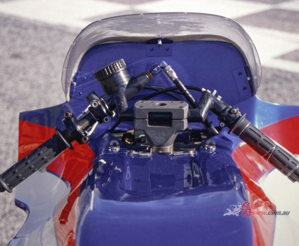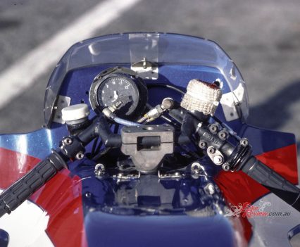 Welcome to the world of trail braking into a turn – something that’s taken for granted nowadays on tele-forked bikes with properly dialed in upside-down forks, but which back then would have been an invitation for the front suspension to freeze, resulting in a locked front wheel, and a trip to the kitty litter. That in turn meant you could brake yards later than the opposition: Leliard for example was braking at the 90-metre mark in practice for the Bol that year at the end of the Mistrale Straight – that’s from a terminal speed of over 280km/h!