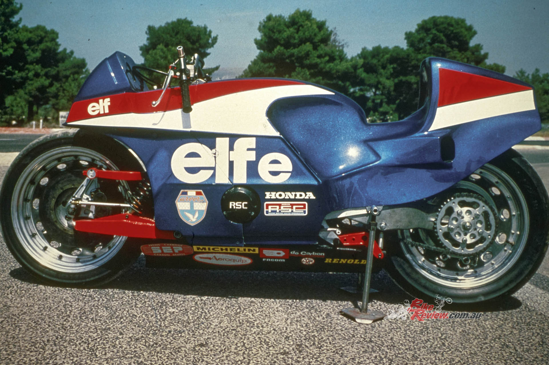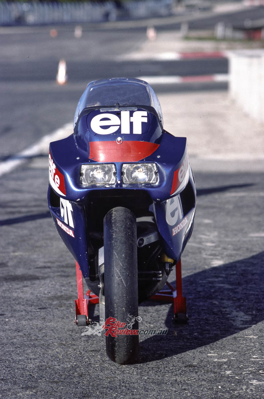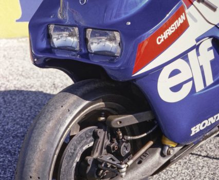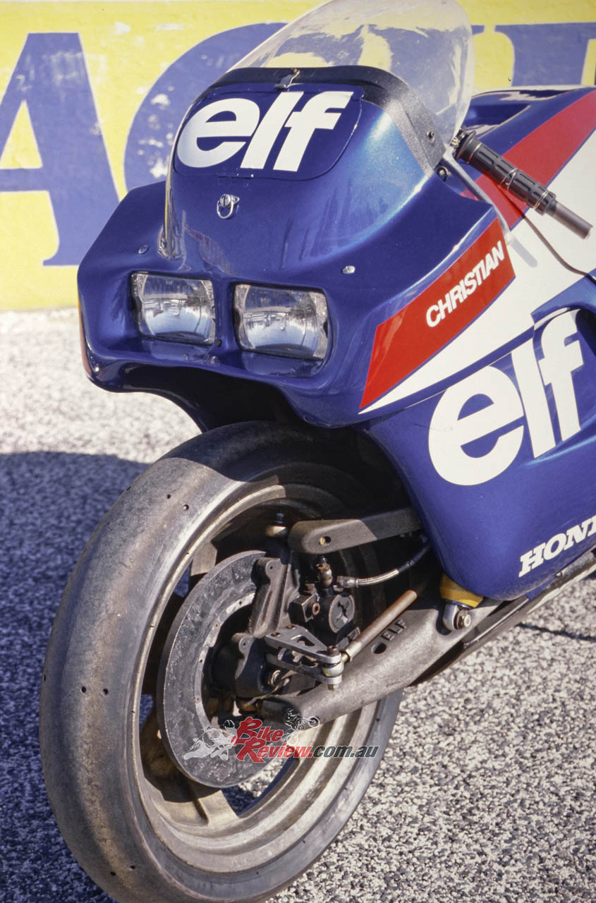 1981-83: ELF links with Honda to produce the ELFe endurance racer, also designed by de Cortanze but this time around a Honda RSC1000 four-stroke engine. It’s raced by top riders like Dave Aldana, Didier de Radiguès, Walter Villa and Christian Leliard to a series of impressive results. Among the ground-breaking features of this hub-centre design are the first use of carbon brakes in motorcycle racing, and the single-sided rear swingarm design later christened the Pro-Arm, and used on the RC30 and its many successors under a licence purchased from ELF which had patented the design.