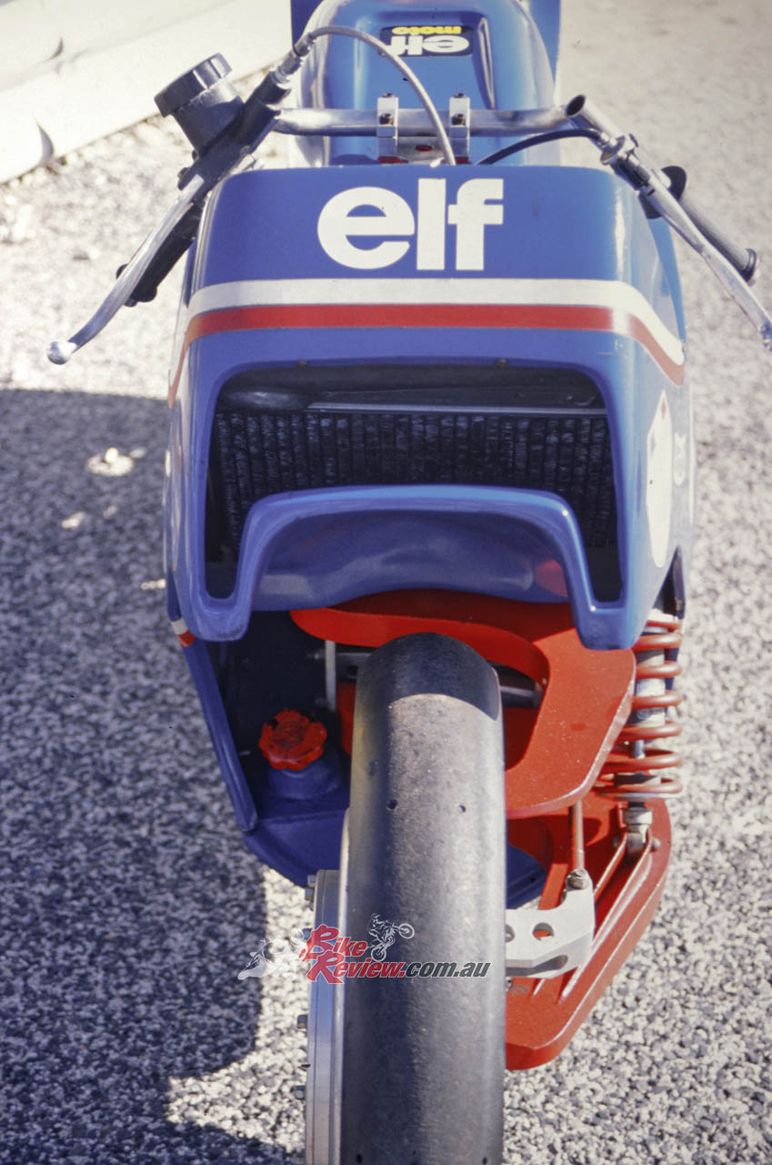 Streets faster than the opposition in a straight line thanks to careful attention to aerodynamics, the ELFe’s bodywork had also been designed to assist it in going round corners. The little handlebar fairings used to be adjustable for downforce till de Cortanze found the ideal position in the wind tunnel to impose maximum downforce on the front wheel, and moulded them into the two-piece streamlining. The rider was also supposed to help by sticking his knee out – seriously! “I used to ride in the classical style – knees in, bum on the seat,” Walter Villa told me. “Then I came to ride the ELF. André found in the wind tunnel that if you sit off the bike and stick your knee out, it not only has a positive effect on weight distribution, but also means the knee acts as a wind flap – it helps you spin the bike round the corner! Now I do it all the time!”