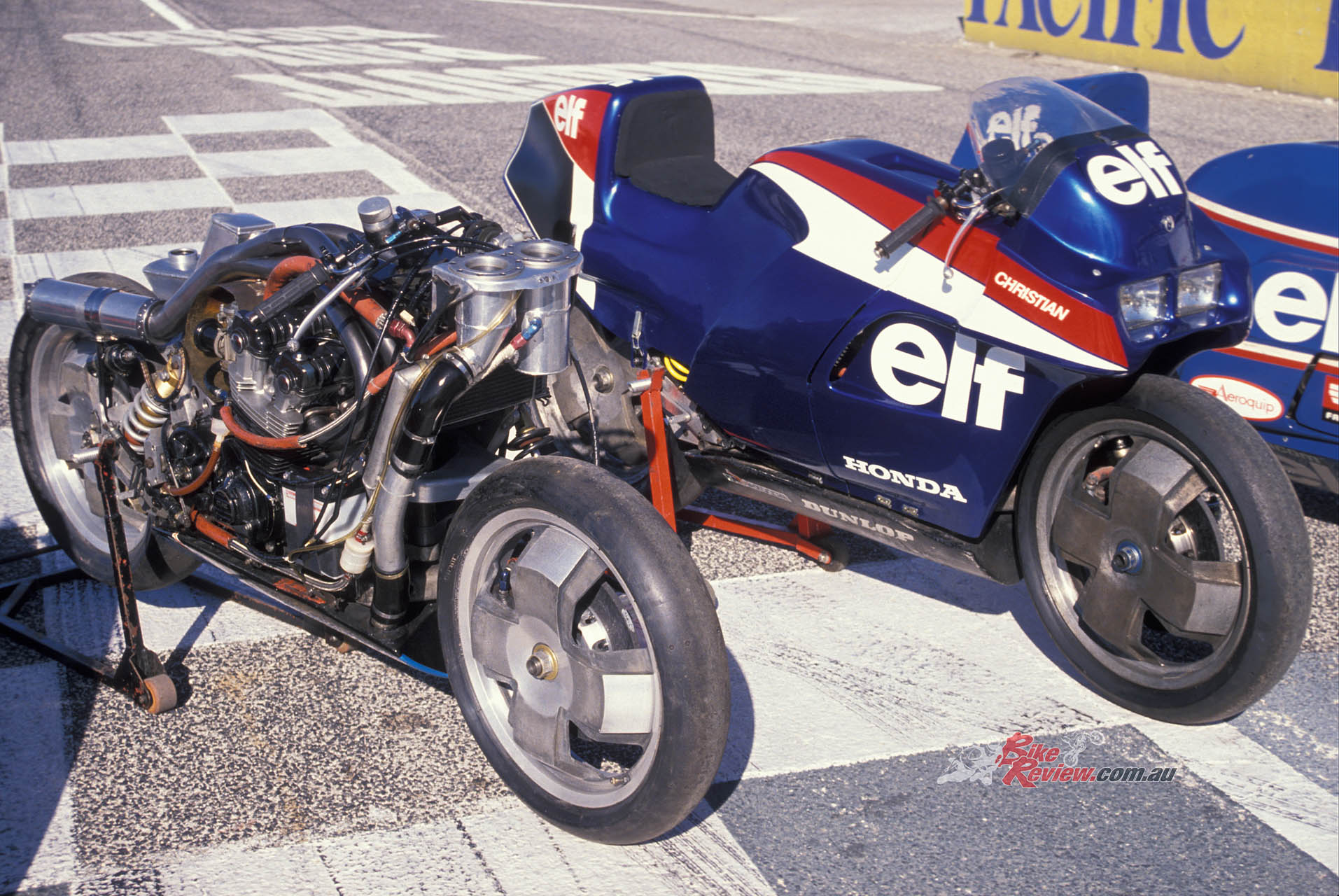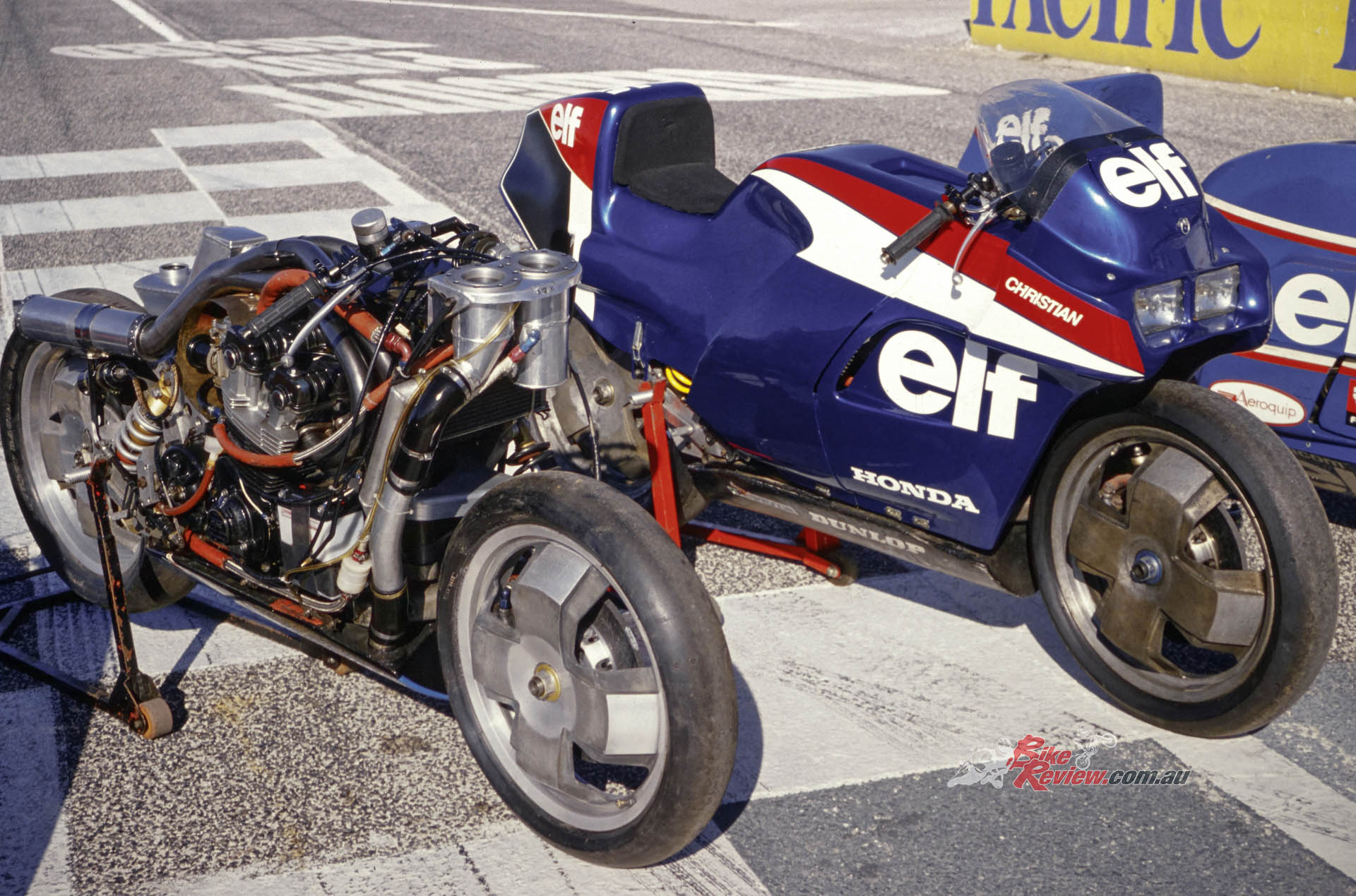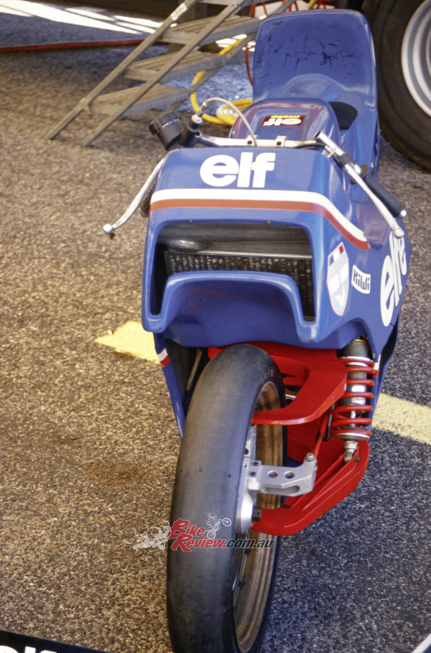 1987: Honda agrees to supply ELF with its NSR500 four-cylinder engine, but this doesn’t turn up until after the start of the season, so the Trema-designed ELF4, broadly based on the ELF3, arrives late and is never properly developed.