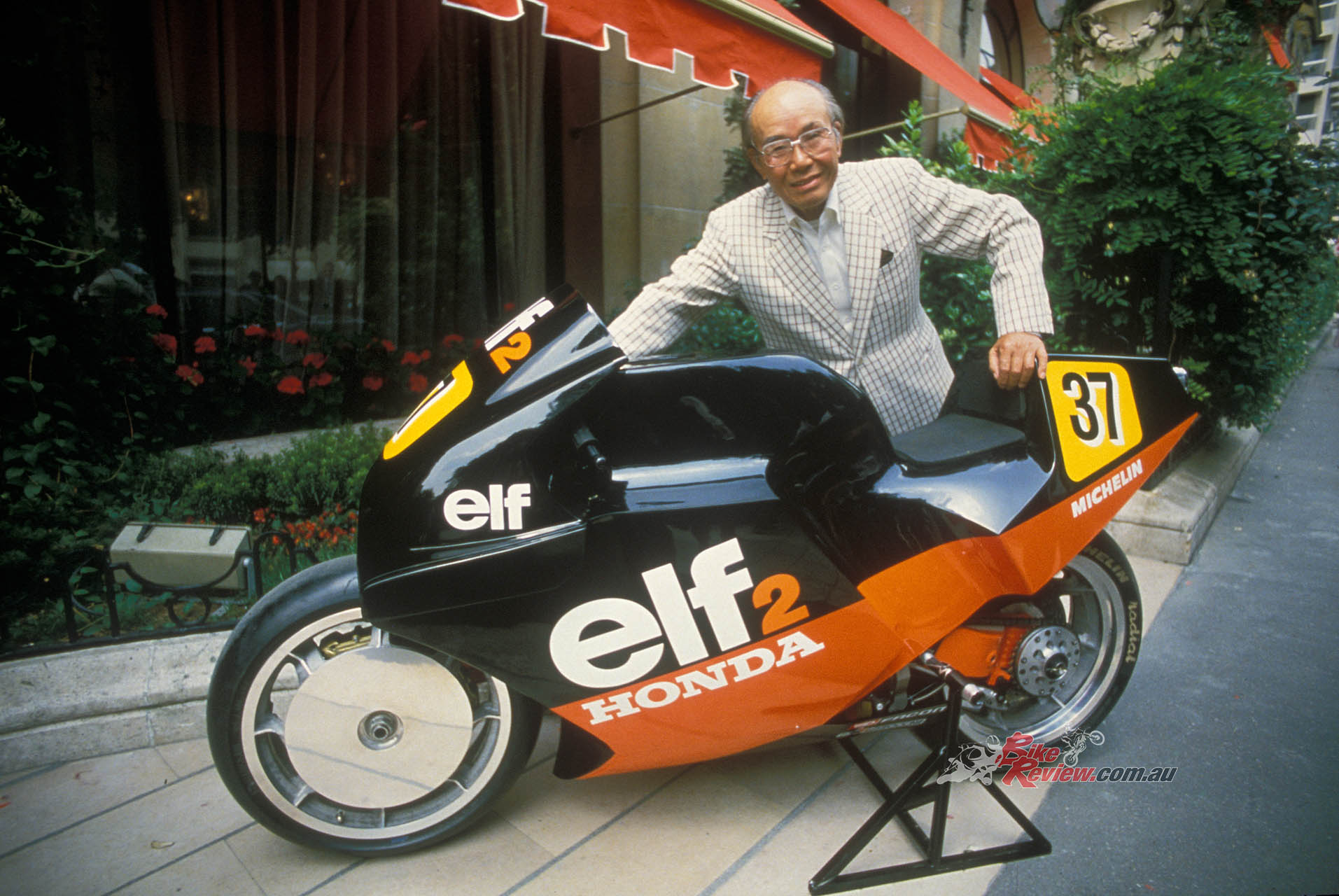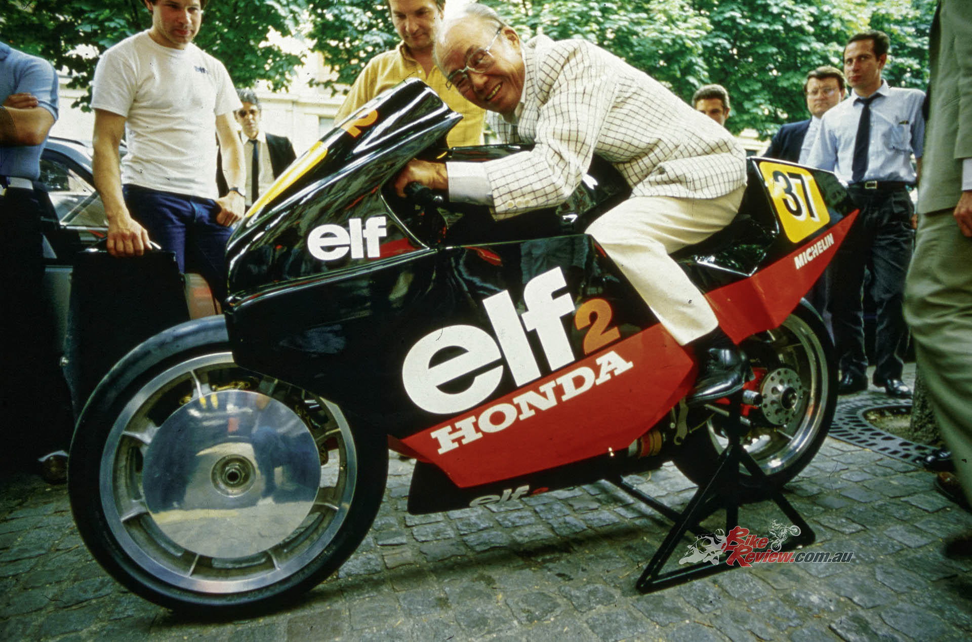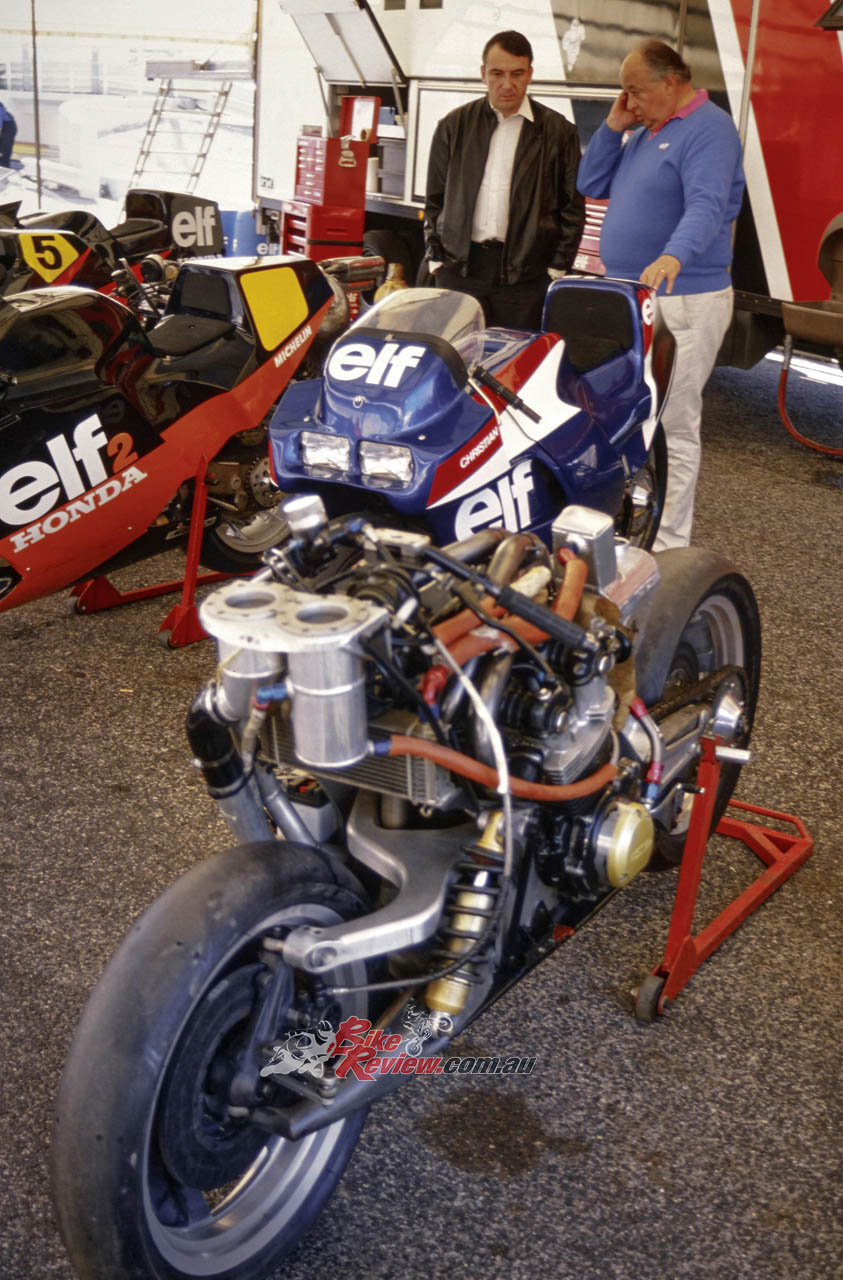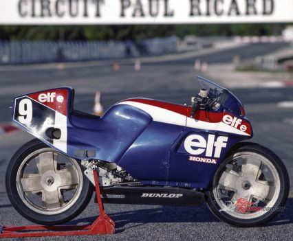 1984: ELF switches to 500cc GP racing with another hub-centre de Cortanze design, the ELF2, powered by Honda’s NS500 two-stroke triple. Soichiro Honda is sitting on the bike!