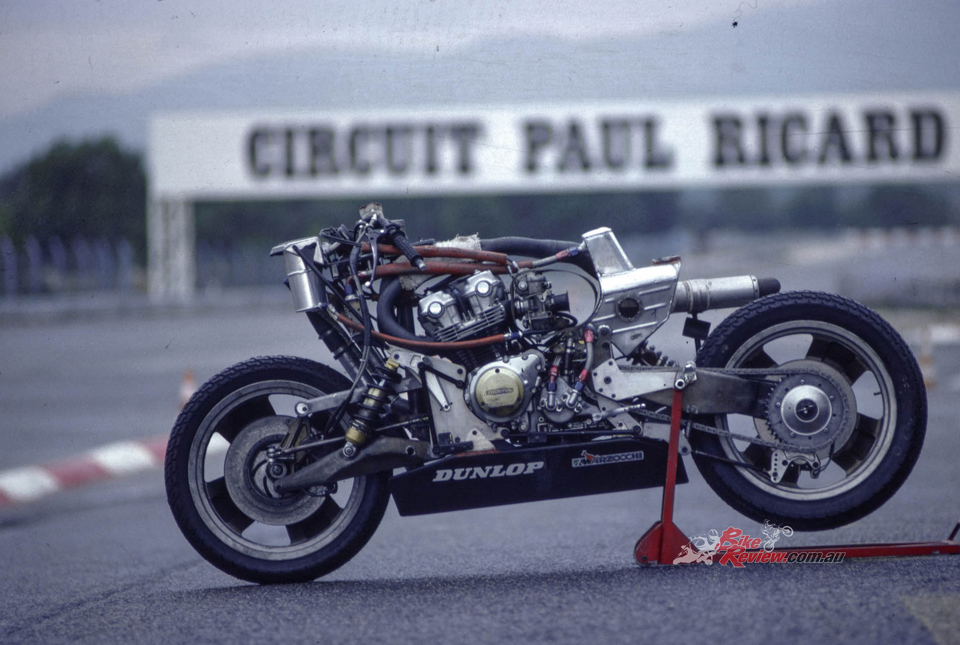 The ELFe’s riding position was slightly unusual because the bars were close together to achieve a wind-cheating posture and you were leaning downwards a bit, too. However, it was perfectly comfortable for me and for its regular riders on the long haul, said Walter Villa, though low-speed manoeuvrability was poor, because it was impossible to exert much leverage on the bars, being so narrowly spaced. In fact, though, you’re not supposed to – and again, I found out the hard way. Coming out of the last turn before the Pits ending lap 1 of my first totally dry session, I cracked the throttle open hard, drifting up onto the kerb as I and most other riders did at that particular spot at Ricard. As the 125 bhp of the Honda engine chimed in all at once I was rewarded with a gigantic shake of the front end – if the tank was in the ‘proper’ place you’d have called it a tank-slapper!