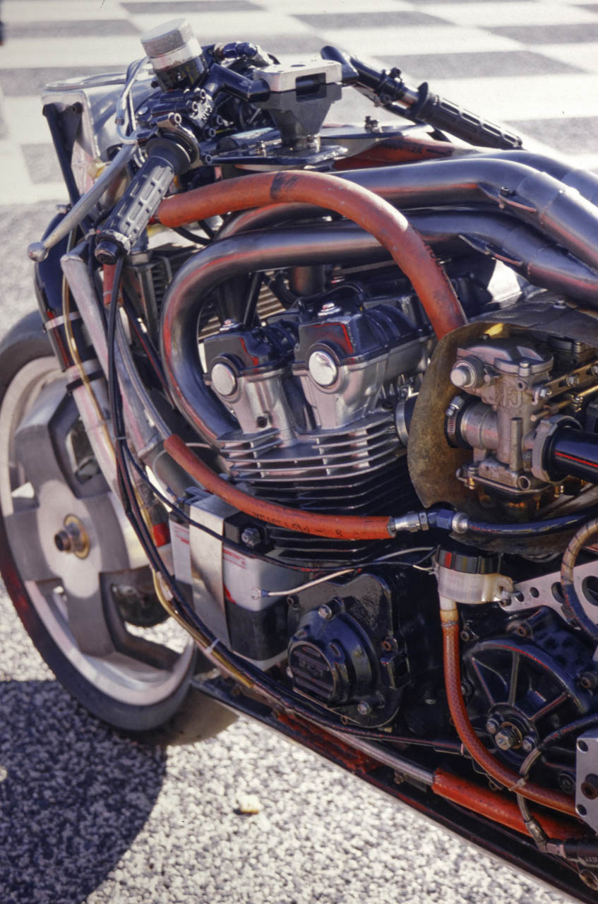 The ELF’s design was centered around de Cortanze’s contention that telescopic forks were an engineering abomination, ready to flex or twist under heavy braking or cornering, especially with the modern generation of slick tyres. If you do away with tele forks, continued the de Cortanze philosophy, then there’s no need for a chassis, which is simply a means of supporting a steering head from which to suspend the fork. So the Honda in-line four-cylinder engine acted as a fully-stressed member, F1 car-style, to which the single-sided front and rear suspension and ancillary components were attached via aluminium plates.