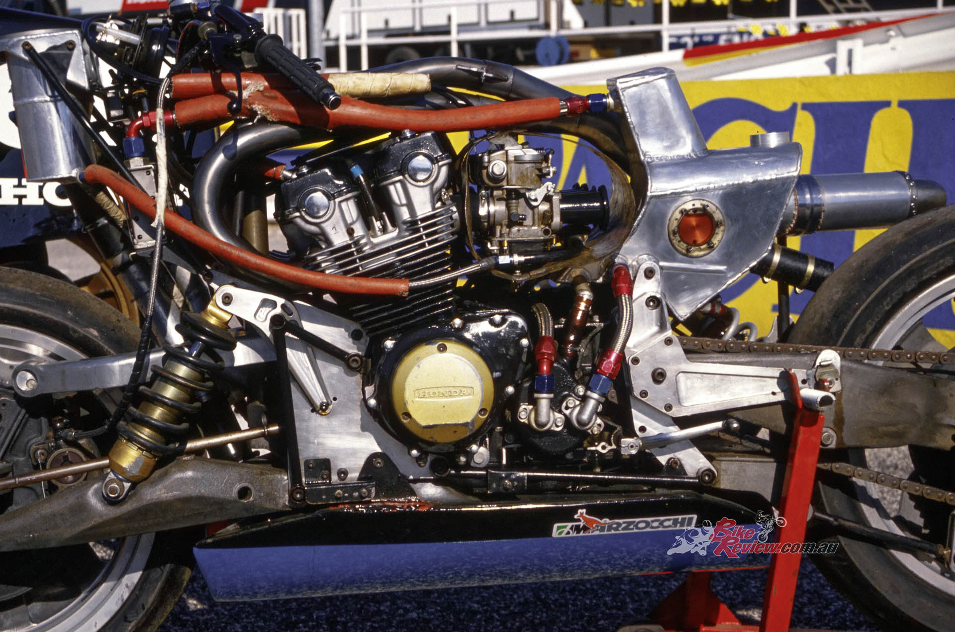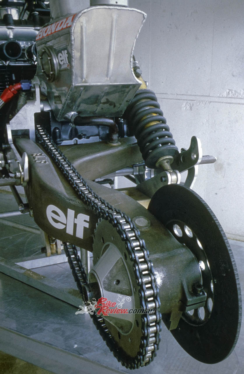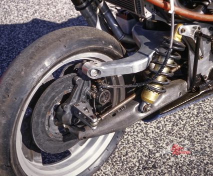 Because of the QD wheels only a single brake disc could be fitted, but here again the team broke new ground, having been the first in motorcycle racing to use carbon discs which weighed next to nothing, and were made by the same French SEP concern that manufactured the brakes for Concorde aircraft. A four-piston Lockheed F2 car caliper was used up front, with a Brembo Serie Oro two-piston rear.