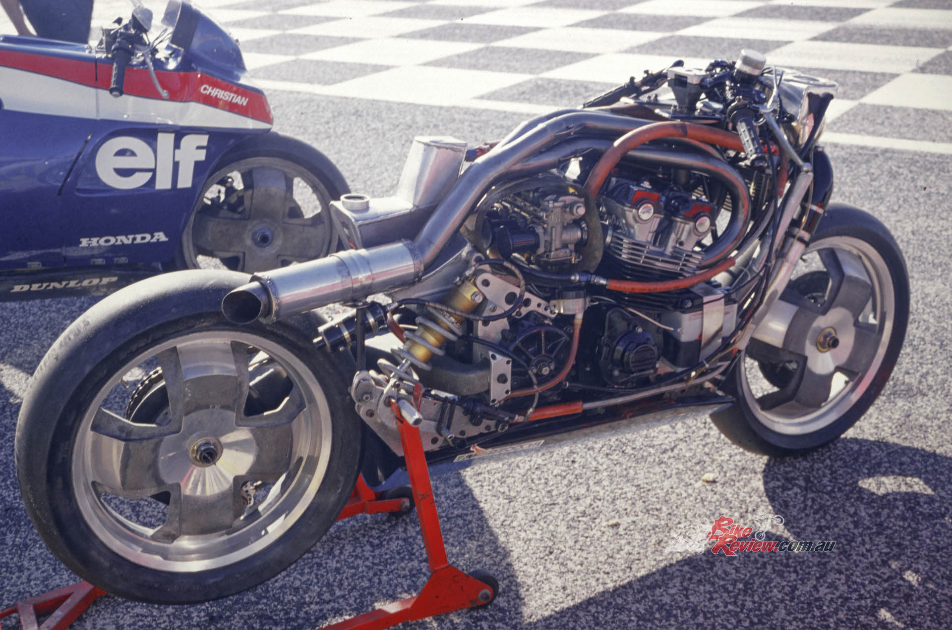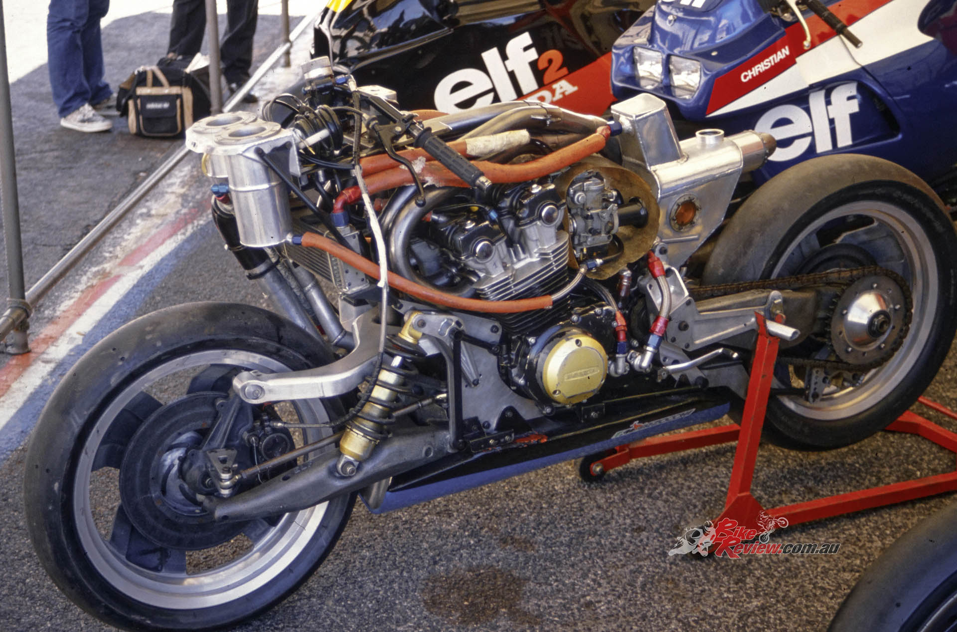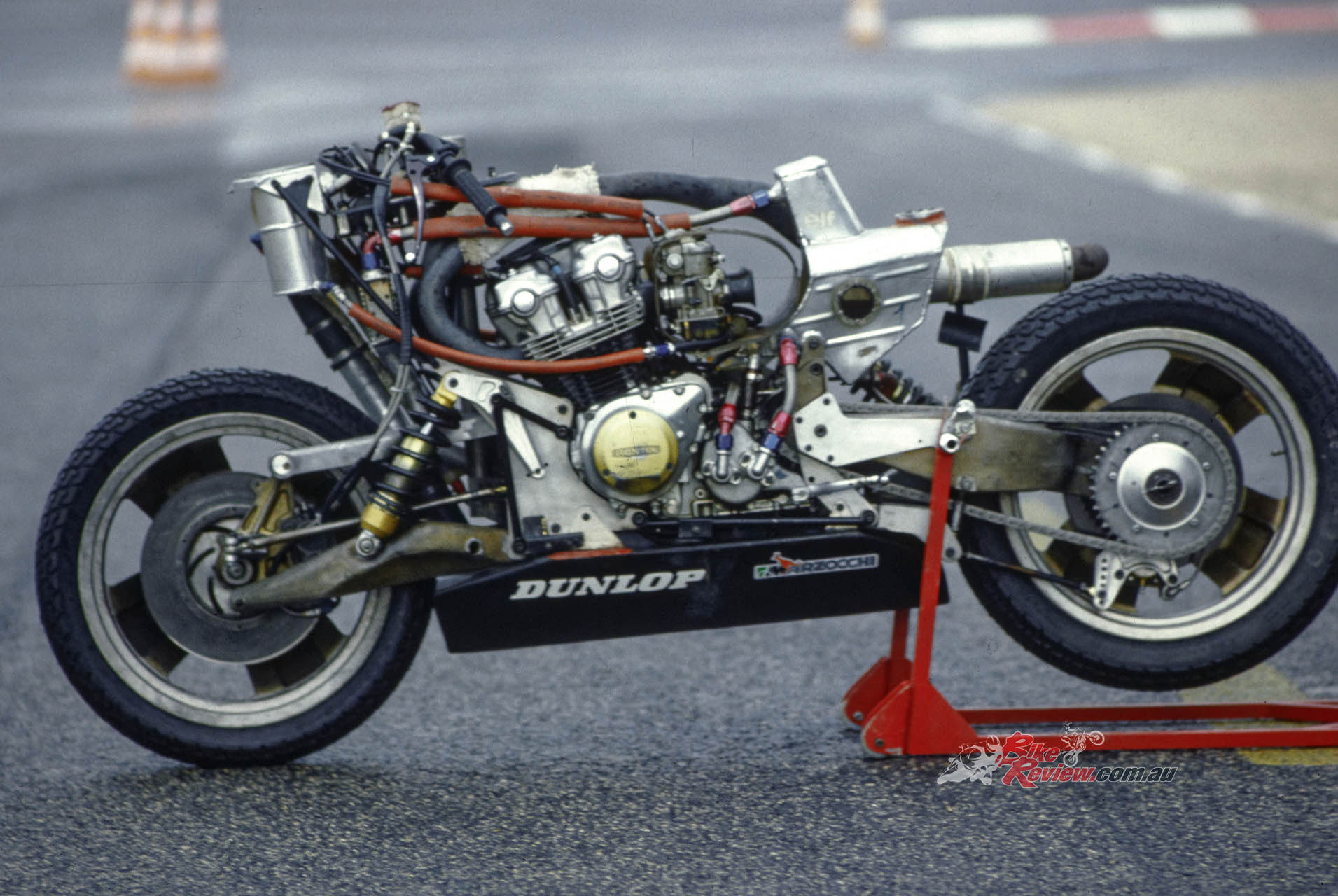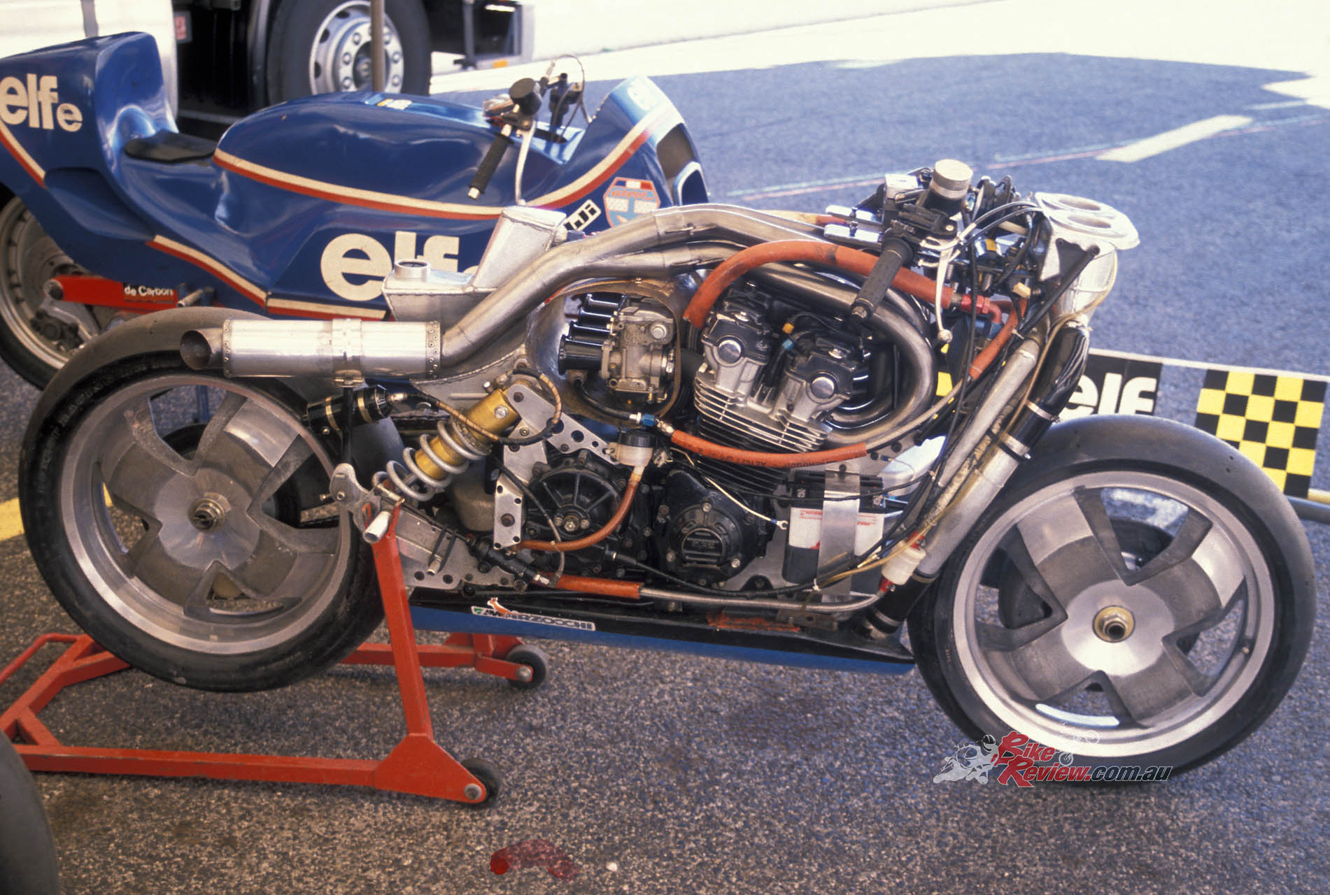The ELFe’s roots lay deep in the heart of automobile technology, even though its concept was mirrored in a classic case of parallel development by the British Difazio/Tomkinson endurance racer – later to be known to one and all as ‘Nessie’ – which first appeared in Laverda-engined form a year before the first ELF X two-stroke Formula 750 prototype was unveiled in 1978.