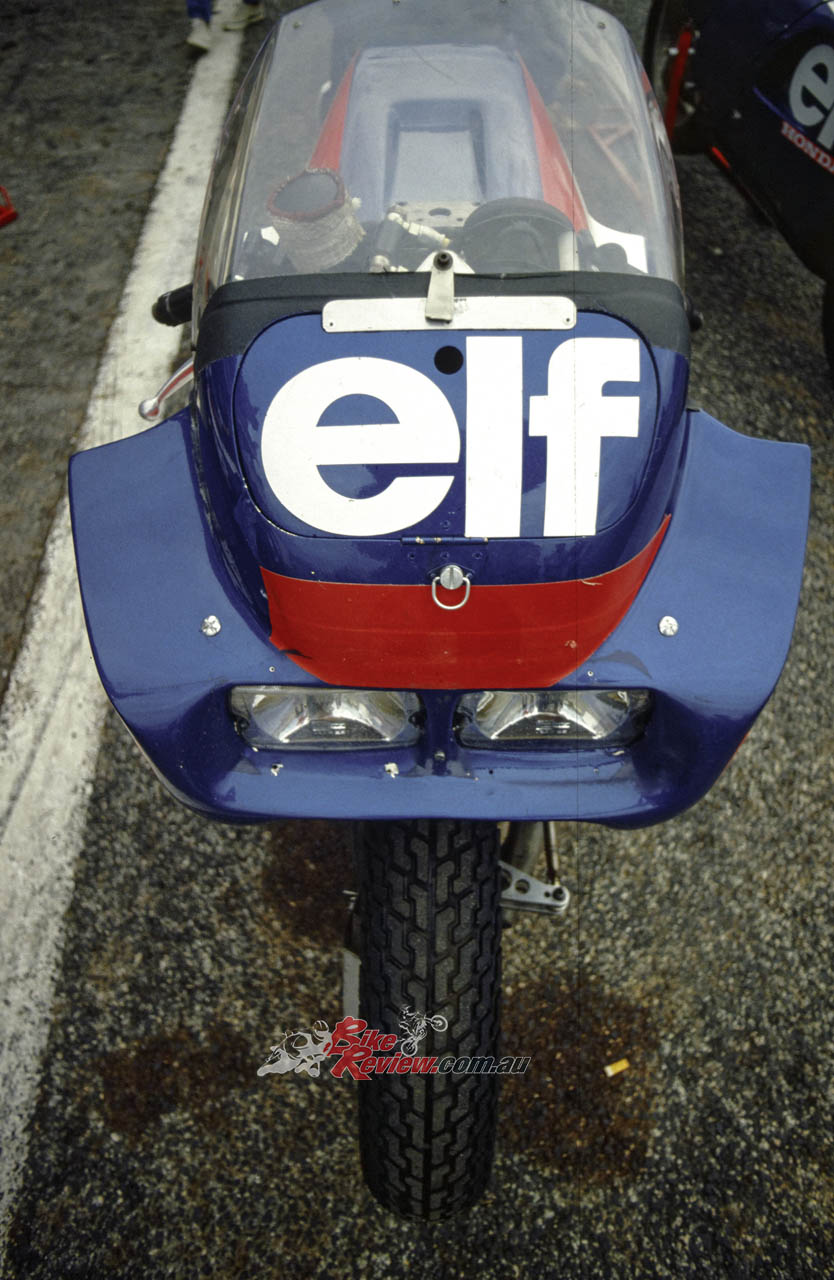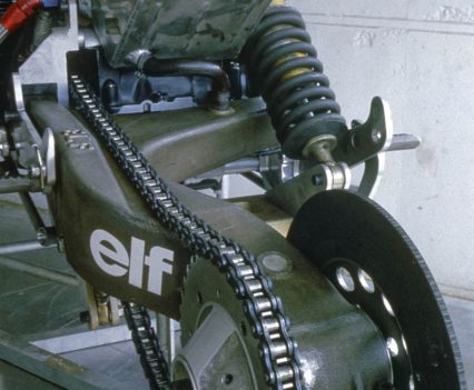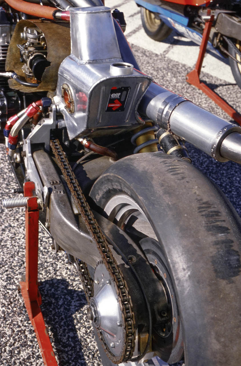 The wheels were specially-made ELIA cast magnesium items weighing a scant 3.2kg each, with single-bolt attachment front and rear that enabled a full wheel change to be carried out in 18 seconds thanks to the single-sided rear swingarm which allowed the wheel to be removed without disturbing the sprocket or chain. The front wheel only could be changed in the time it took to add 23 litres of fuel and change riders – an astounding 11 secs. “A little slow, but we lose two seconds having to open the flap in the nose which covers the filler!” explained head mechanic Alain Chaligne, de Cortanze’s right-hand man throughout the ELF project. So 11 seconds to change the front wheel, add five gallons of four star and swap riders is slow??