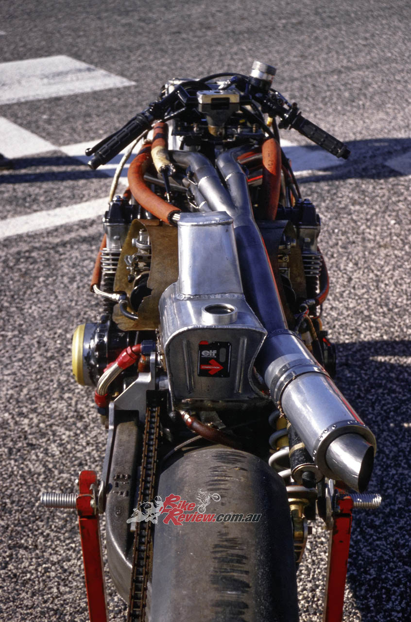 To assist in lowering the centre of gravity, de Cortanze had placed the fuel tank beneath the engine, in contrast to the exhausts which now ran up and over the top of the motor – a format which was imitated by Honda on its first-generation NSR500 in 1984. Fortunately the wind-tunnel tested all-enveloping aerodynamic bodywork was thick enough to prevent the rider becoming overheated. “Empty exhausts weigh less than a full fuel tank,” said de Cortanze!