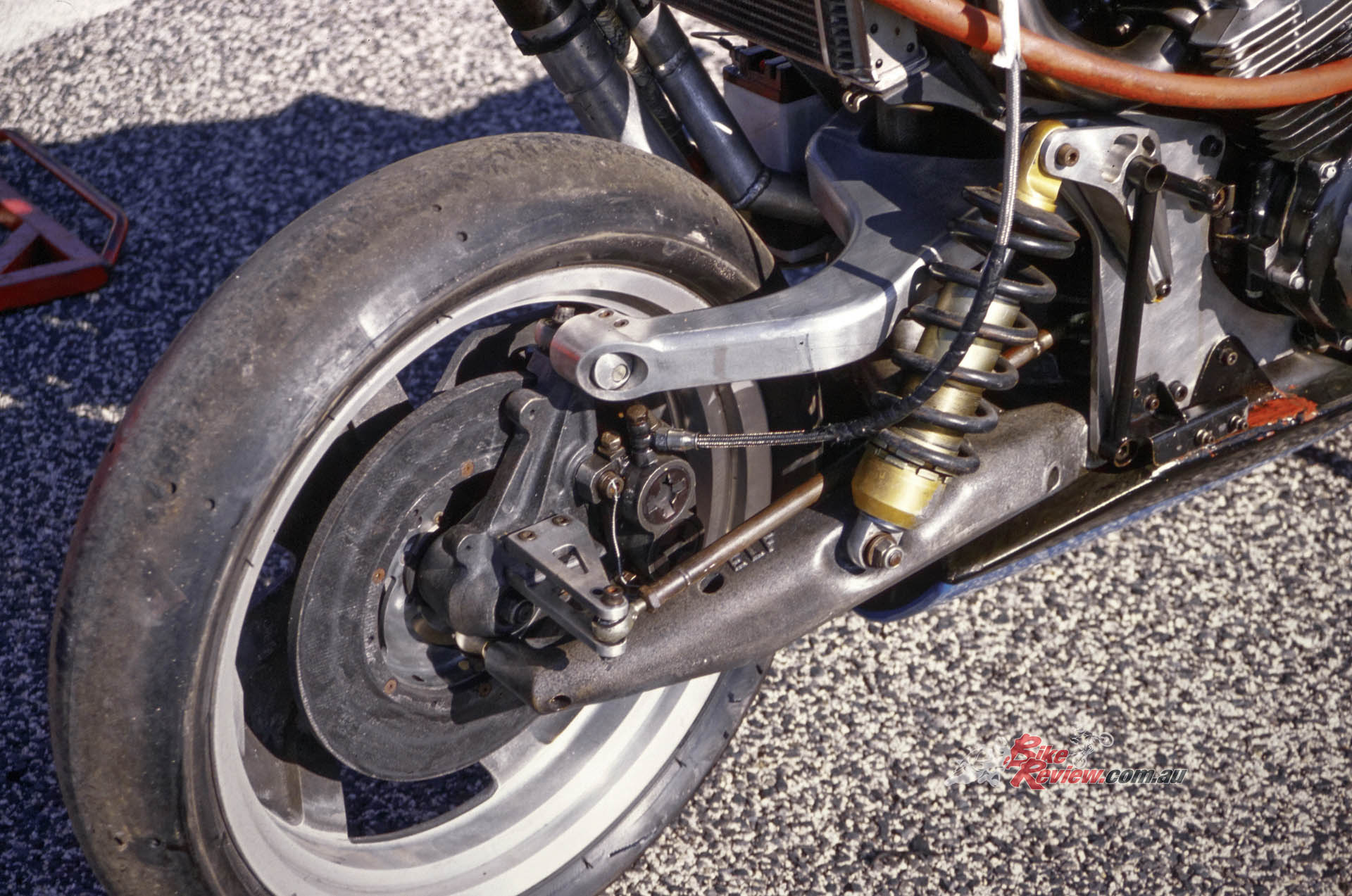 The team only once ever had to change a chain even in the course of a 24-hour race, which was a great advert for the ELF’s rear suspension design, which ensured constant chain tension by placing the pivot of the cast magnesium swingarm coaxially with the gearbox sprocket. Another special Marzocchi shock sat inboard of the rider’s right foot, working off the swingarm via a set of aluminium rocker arms, the whole attached to the rear of the gearbox via more dural plates.