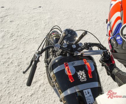 19in wheels were fitted front and rear, shod with Avon Roadmaster rubber, with only a rear seven-inch SLS brake made from a mixture of Vincent and home-made parts to stop the bike – running at Bonneville is all about go, not slow, so no need for a front brake so as to minimise friction….
