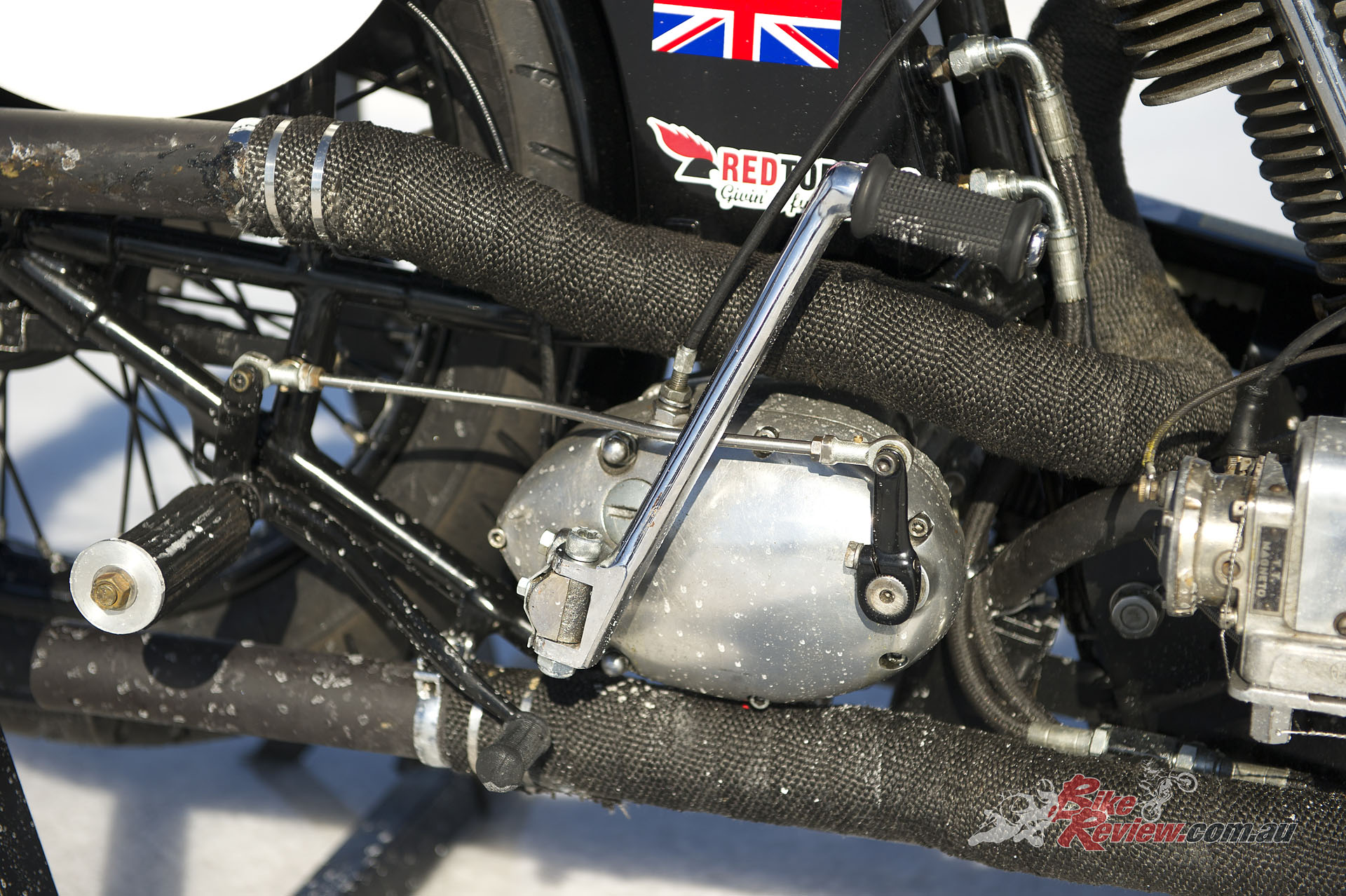 Finally, the specially-built five-speed transmission used a Nourish gearbox shell with a kickstart, Triumph Trident main shafts, a T150 inner end cover and T160 outer, and aftermarket performance gear pinions chosen to deliver an optimum set of gear ratios for the Salt Flats. That meant a relatively tall bottom gear to get the show on the road, then second and third quite close together, a bigger gap to fourth, and a much bigger one to fifth, which was a 1:1 ratio rather than an overdrive, all matched to a dry clutch with ceramic plates, and a belt primary drive. The exhaust system was basically a straight through equal length design concocted by Sam himself, with each pipe having an equal number of bends to its mate.