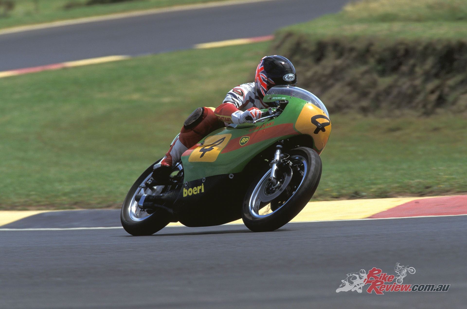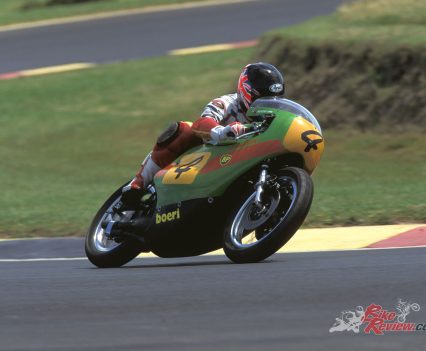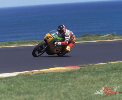 That’s when I wasn’t holding on tight to stop getting left behind when the power suddenly came in strongly, though – because make no mistake, riding this bike is an acquired skill which 15 laps of the Phillip Island GP circuit saw me only partially trained in. The first trick is to start it: the clutch action is very stiff, so it’s quite hard to catch the engine as it fires and a real knack is needed to match throttle opening to engine speed, making the push-start GPs of the era a bit of a challenge that presumably came with practice. Even once you¹ve got it fired up (OK, I admit it: I had to get Brendan to start it for me!), getting it off the mark is hard, too: more practice needed, AC!