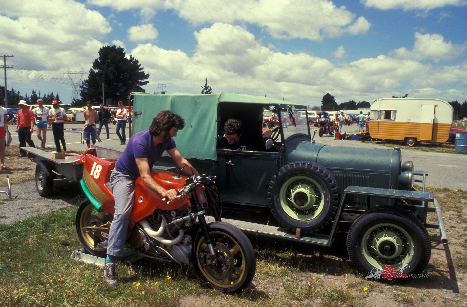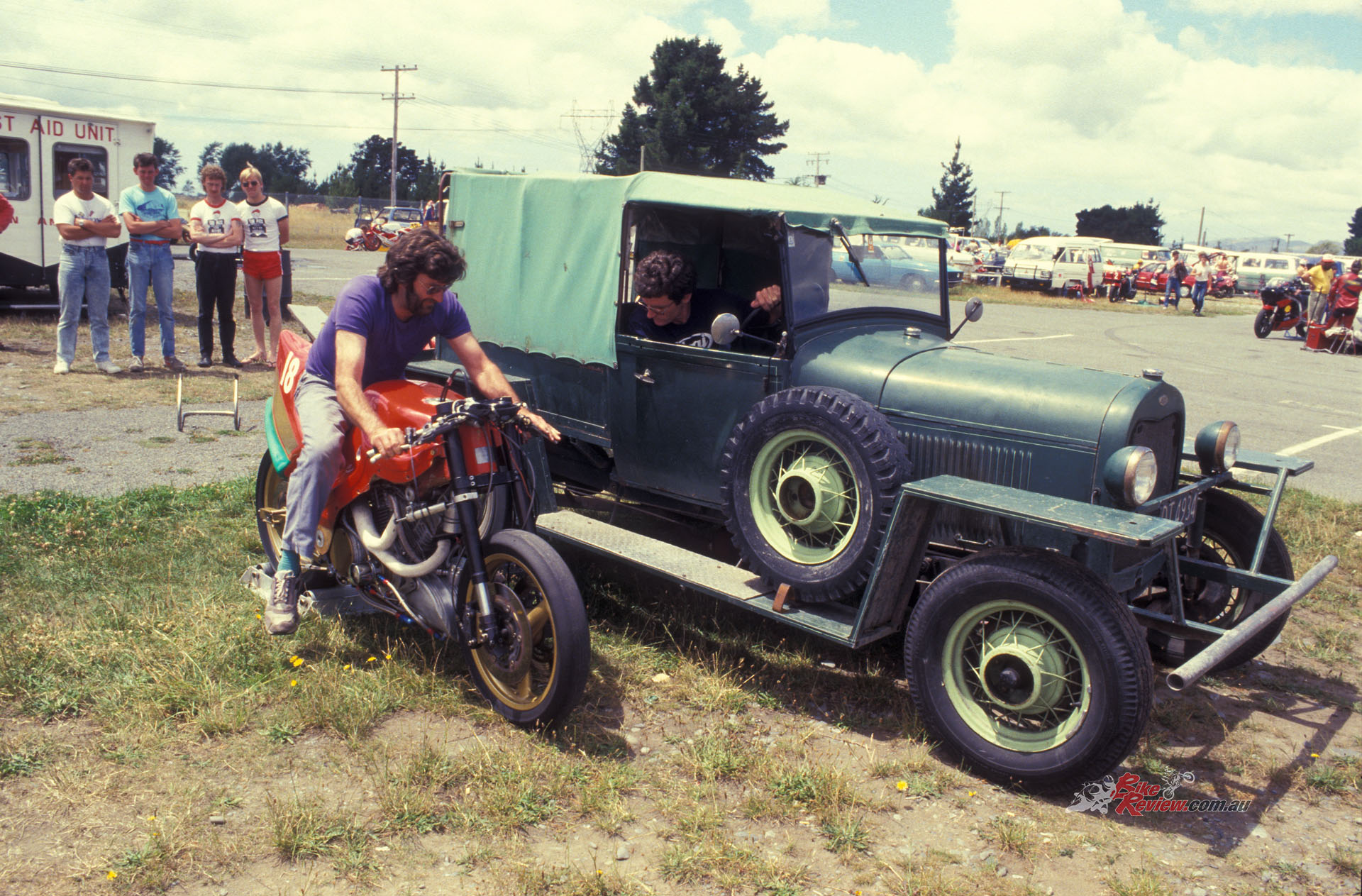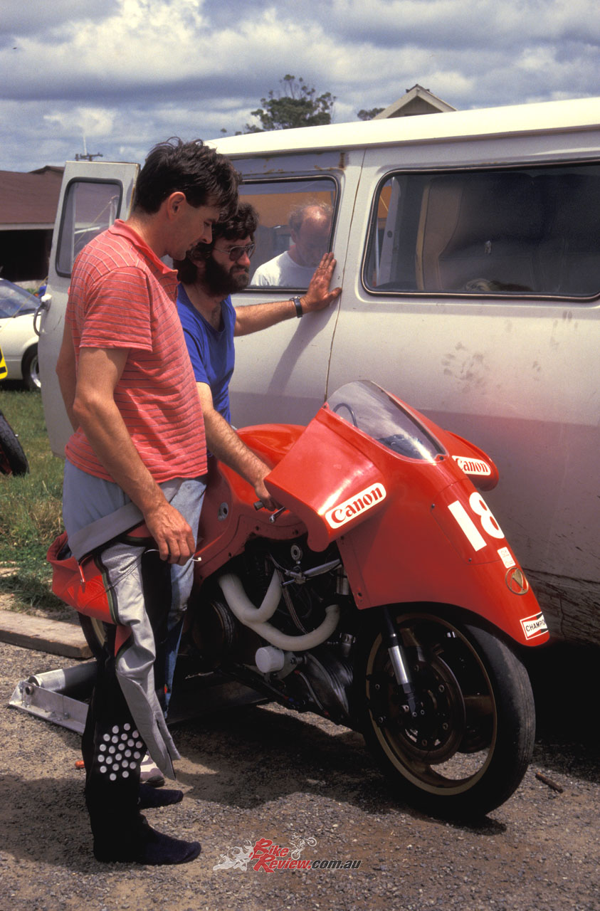 Actually, the biggest problem I had when I first ventured aboard the Denco-Britten at Ruapuna in January 1988 during a practice day before the final round in the 1987-88 NZ National Championship series that weekend, was nothing to do with the bike’s specification as such. It was just that its creator wasn’t there, for the very good reason that it had spat him off earlier that week under braking at the end of the long drag-strip main straight, and then added injury to insult by jumping on top of him and playing skateboard for several dozen metres, by which time a good part of John Britten’s skin and even some bone had been worn away. But from his hospital bed, John dictated that the show must go on, which is how come Mike Sinclair and another of the Britten boys, the bearded Allan Brodie, turned up at Ruapuna with the rebuilt Denco-Britten in the back of a rather ancient, unrestored Model A Ford ute!
