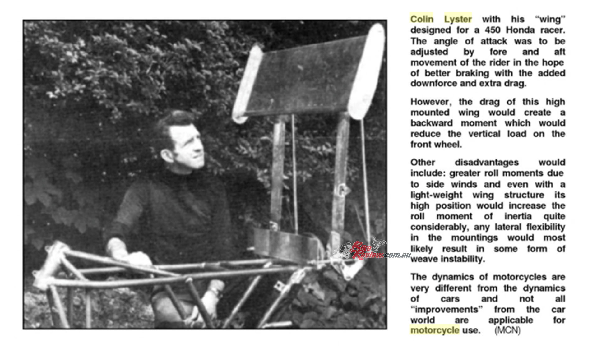 “The winglets are my own solution to achieve a desirable increase in the frictional loading of the front tyre while cornering,” stated John Britten.