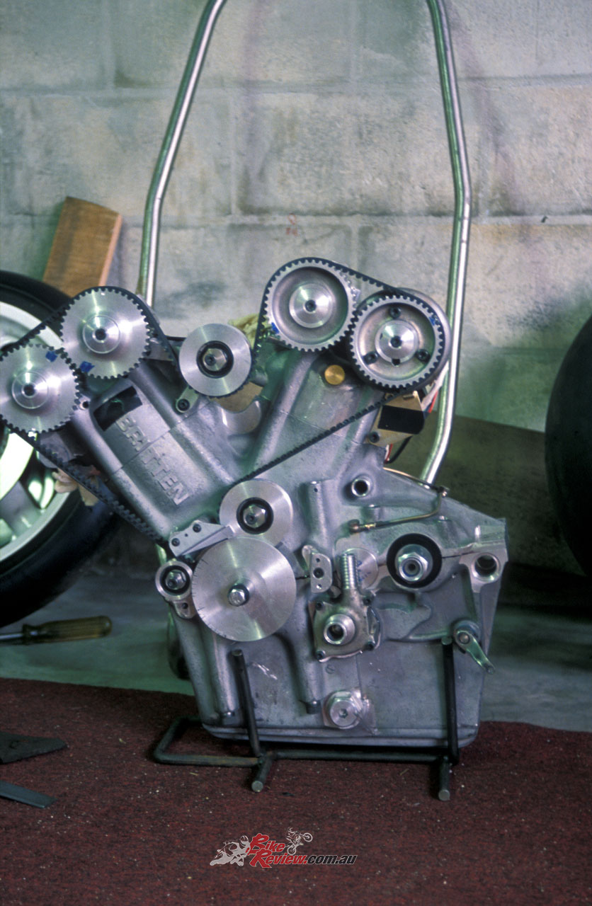 The fast but fragile Denco engine’s unreliability forced John to design and build his own engine, the first liquid-cooled 60° V-twin DOHC eight-valve Britten, which debuted at Daytona in 1989.