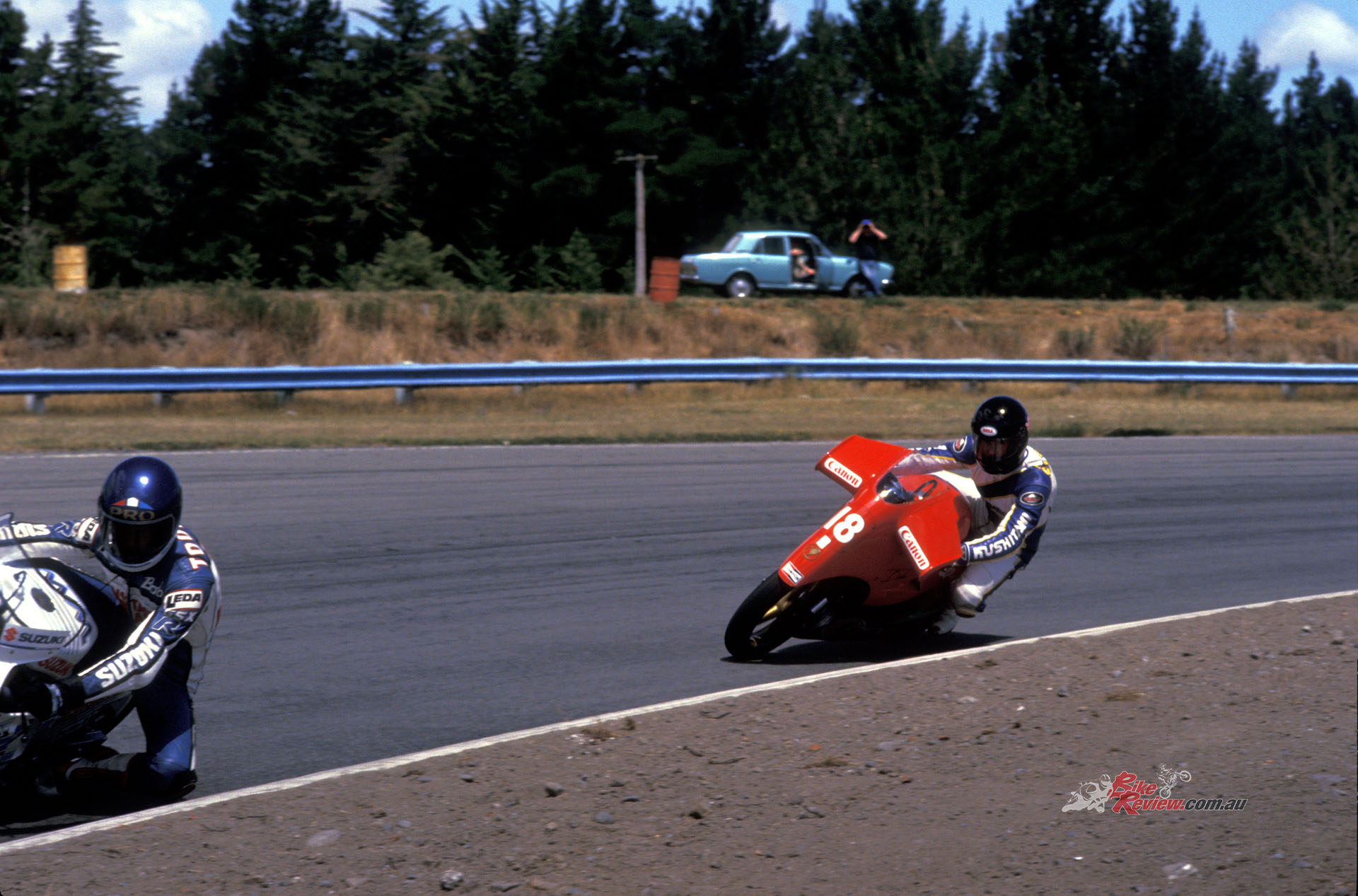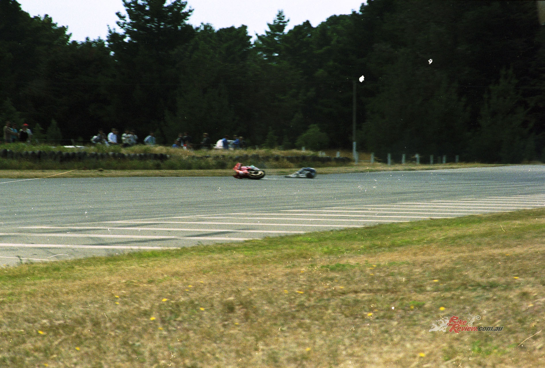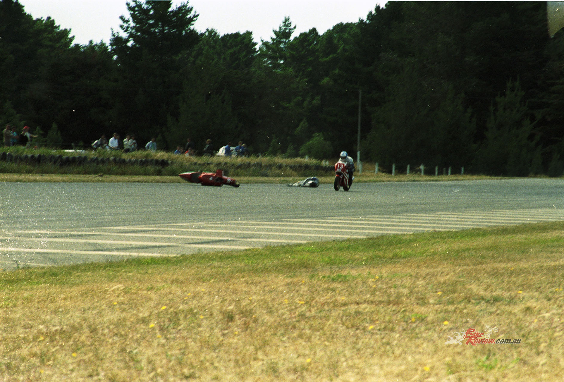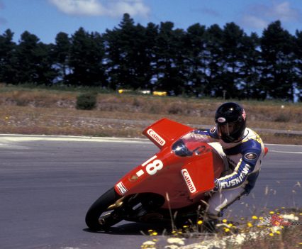 But you can maybe guess the rest: on the last corner of the final lap it cut out again while I was cranked hard over round the long, fast left-hand sweeper leading on to the Ruapuna finishing straight, just a few hundred metres from the chequered flag and that prized NZ title – but then it chimed in again hard while I was still leaned over, sending me climbing the staircase to highside heaven and off to hospital with a broken arm to join John Britten there! What might have been, if only….