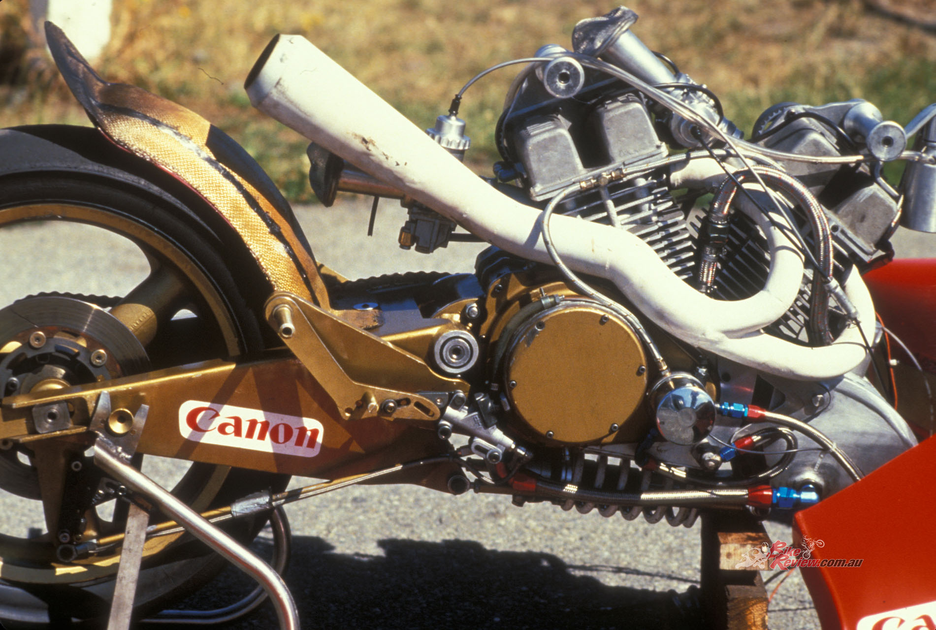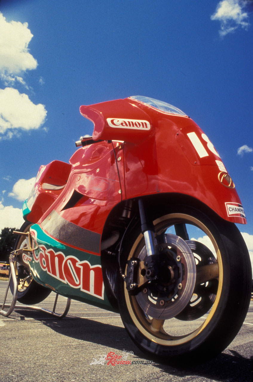Eventually he arrived at a form which enabled him to begin the moulding process, using a mixture of uni-directional carbon-fibre, Kevlar mat, high-density closed-cell foam, and his own preparation of vibration-resistant keying compound. The result incorporated internal ducting both to deliver cool air to the fully-enclosed engine – which was not liquid-cooled, remember – as well as to extract heat, while the curiously-shaped swingarm was a steel fabrication aimed at sacrificing weight-saving for stiffness.