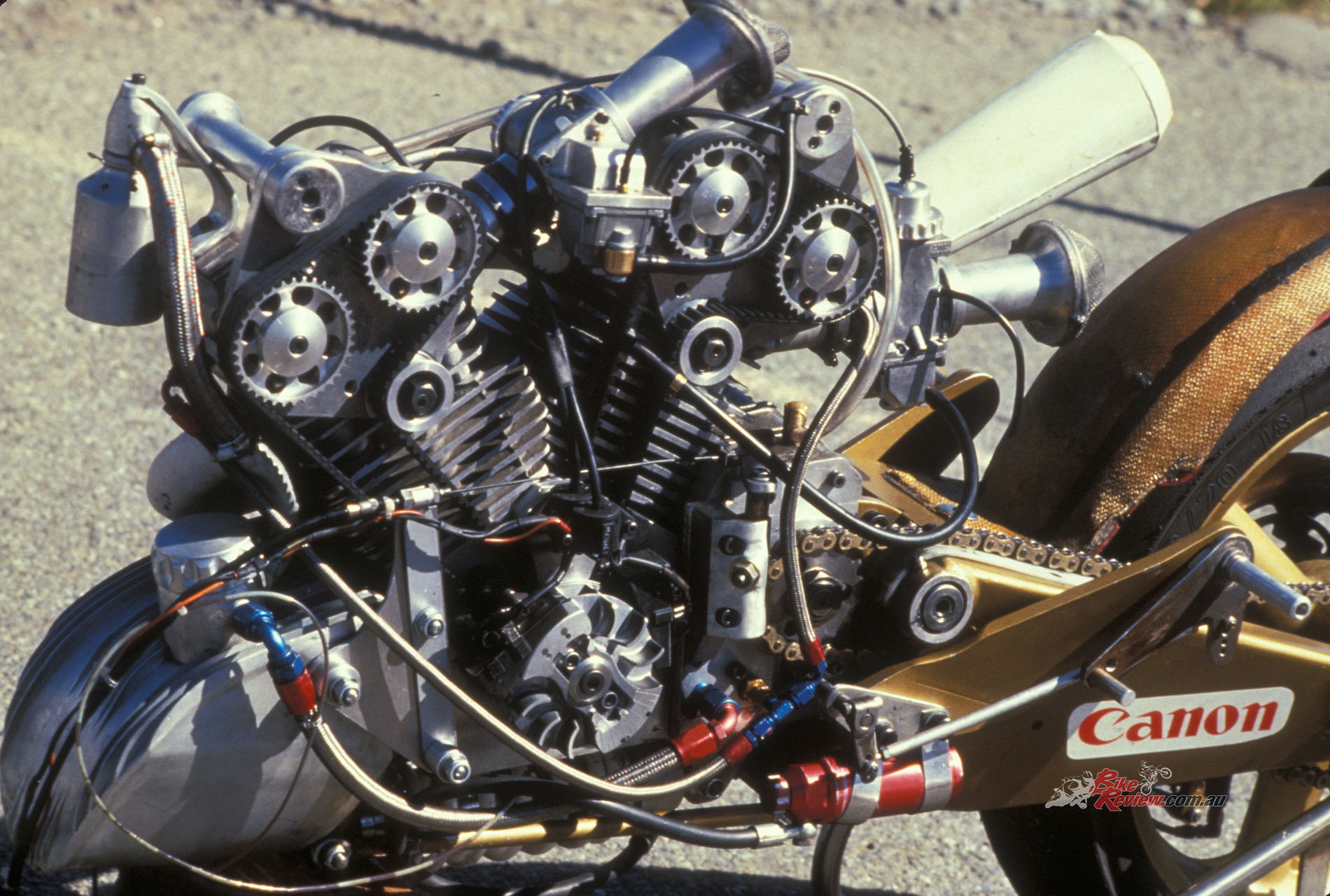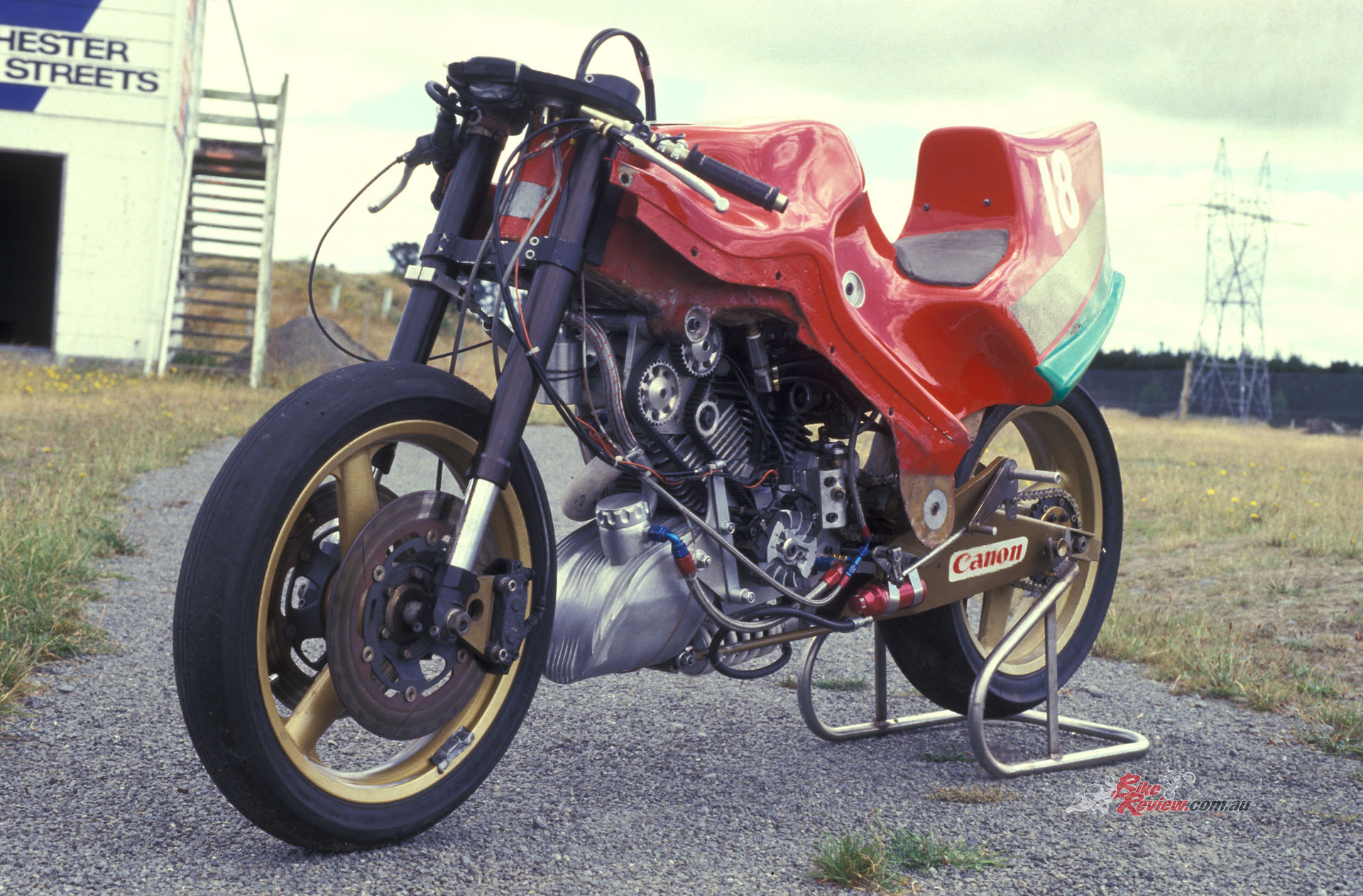 Denco was a local manufacturer of hand-made 500cc Speedway engines, as well as a one-litre V-twin variant for use in the hair-raising world of Sidecar Speedway, obtained by mounting two of the solo singles at 60° to each other on a common crankcase. The fact that methanol was allowed in NZ road racing made the use of this engine to power John Britten’s project racer feasible, and in March 1987 he debuted the completed bike in the big BEARS meeting (standing for British, European, American Racers) at his local Ruapuna track outside Christchurch – having already dropped it on its side for the first time in trying to make a U-twin while testing it in the street outside his workshop in Christchurch!